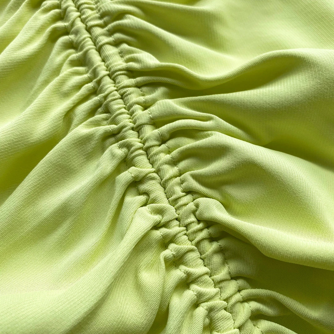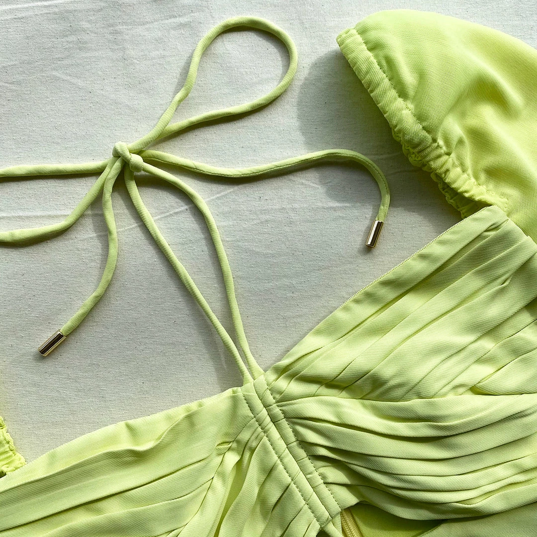 This mini dress is cut from lime stretch crepe. It is designed with a halter neck tie and sweetheart neckline with gathering through the bust. It features a cut out waist design and a ruching at the front of the mini skirt. Check the Size Guide to find your perfect fit.