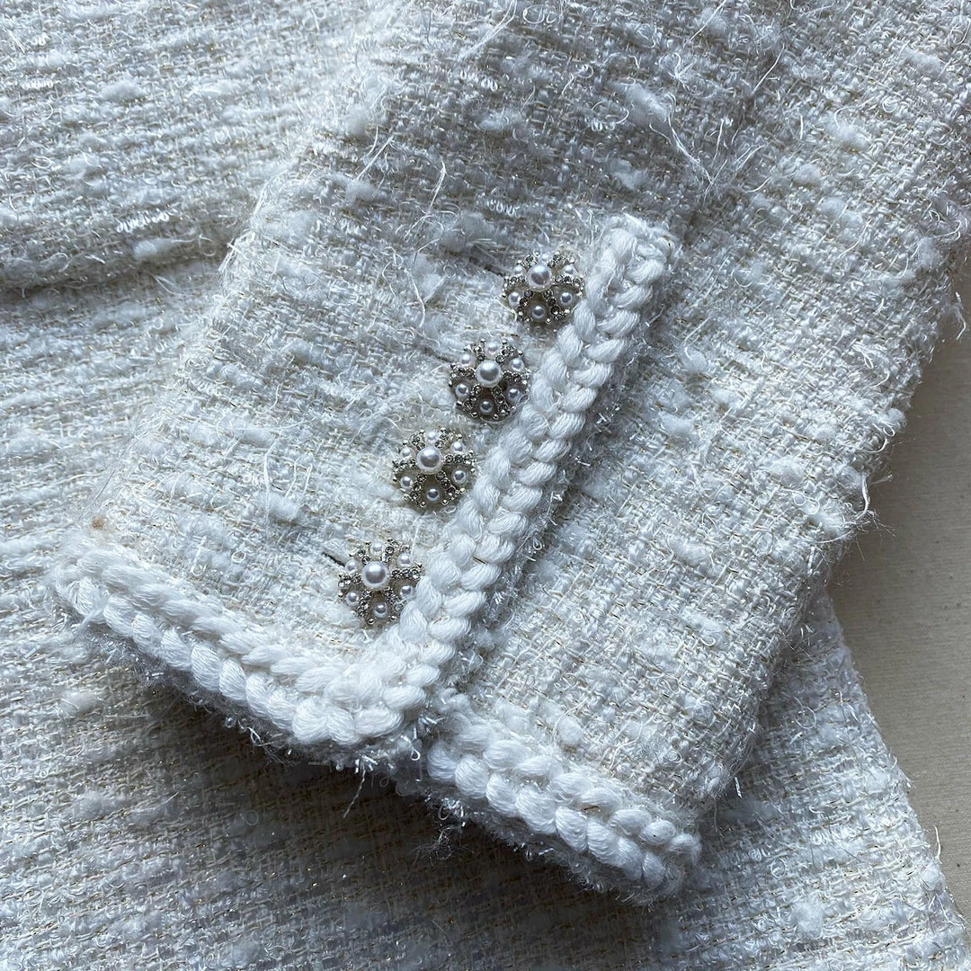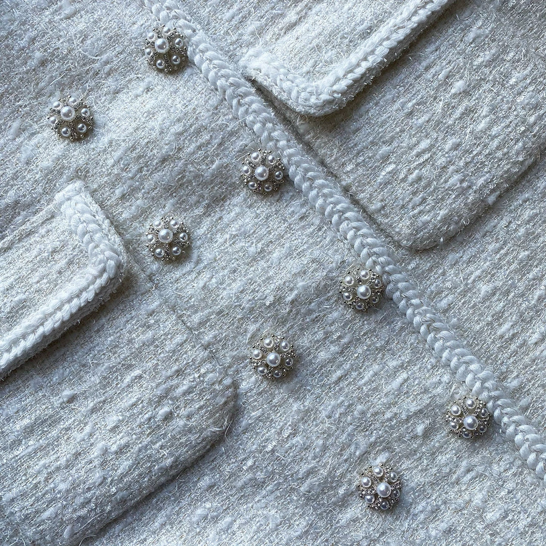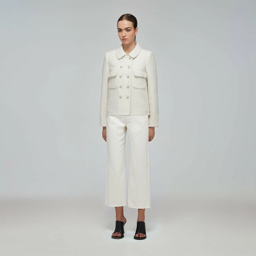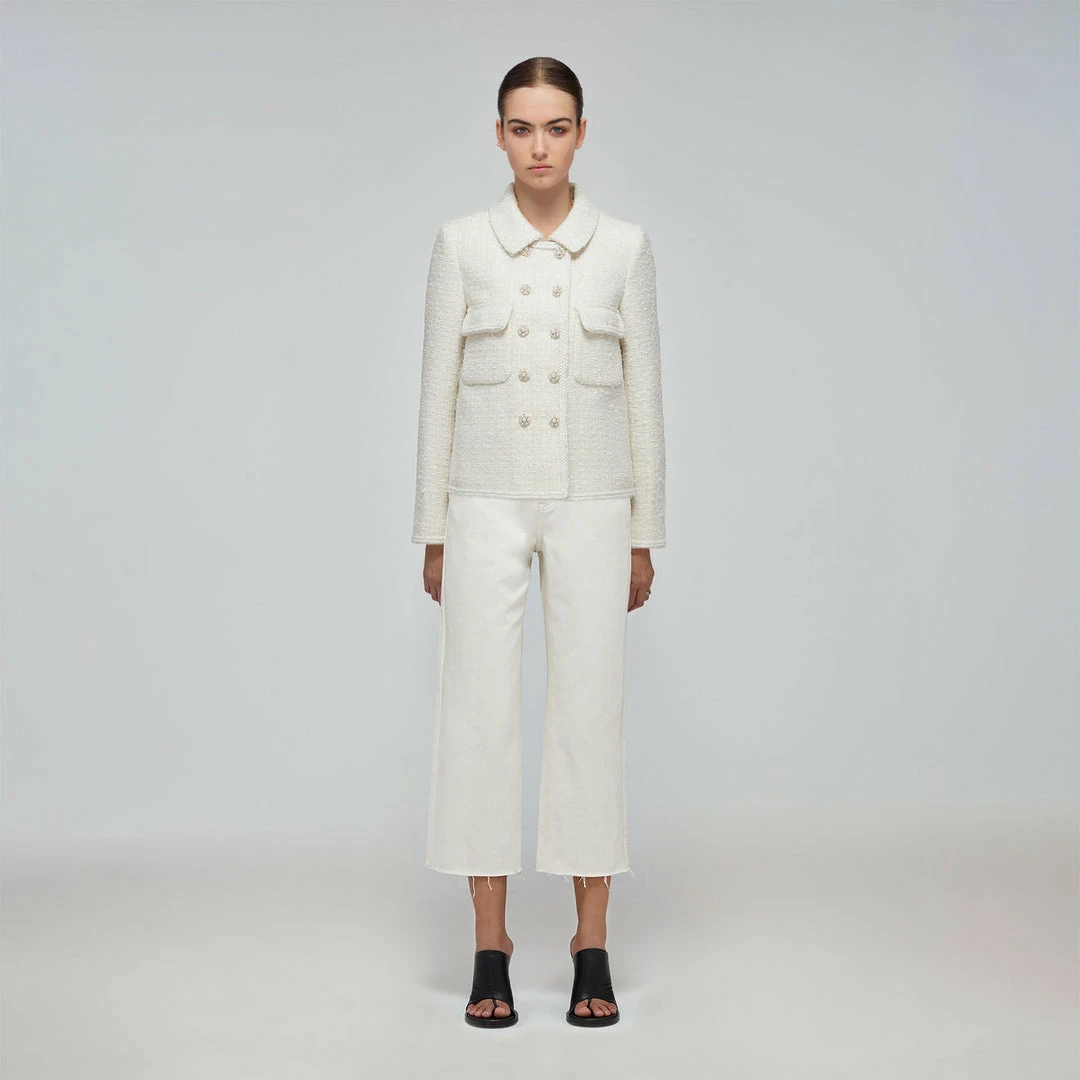 This double breasted looped boucle jacket is designed with a collar and tonal braid trims. It features flap pockets and fastens with pearl buttons. It features shoulder pads for a subtle structured silhouette. Check the Size Guide to find your perfect fit.