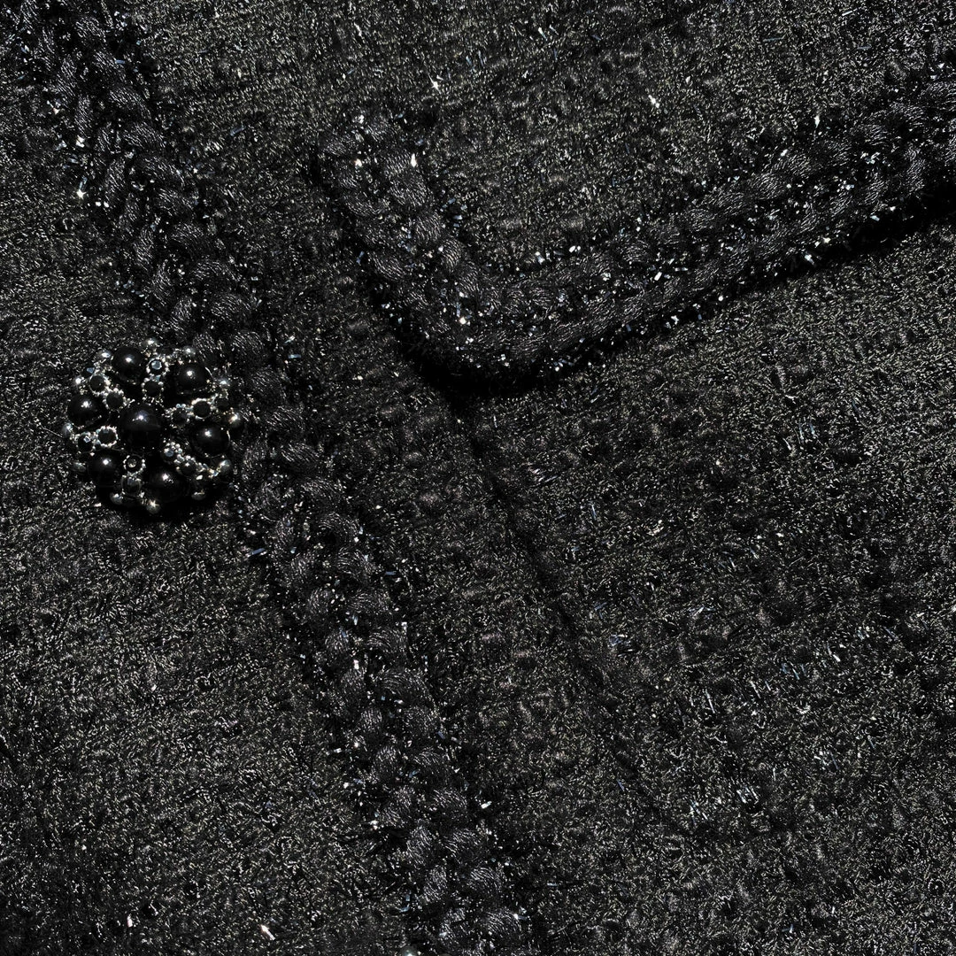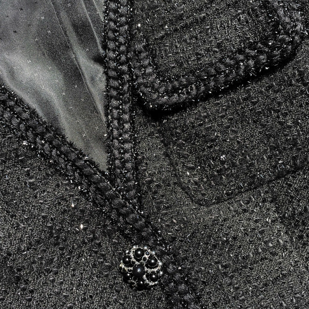 This tailored jacket is cut from black bouclé. It is designed with a flattering v neckline and fastens with tonal diamanté buttons. It features a removable belt at the waist. This style is lined. Check the Size Guide to find your perfect fit.
