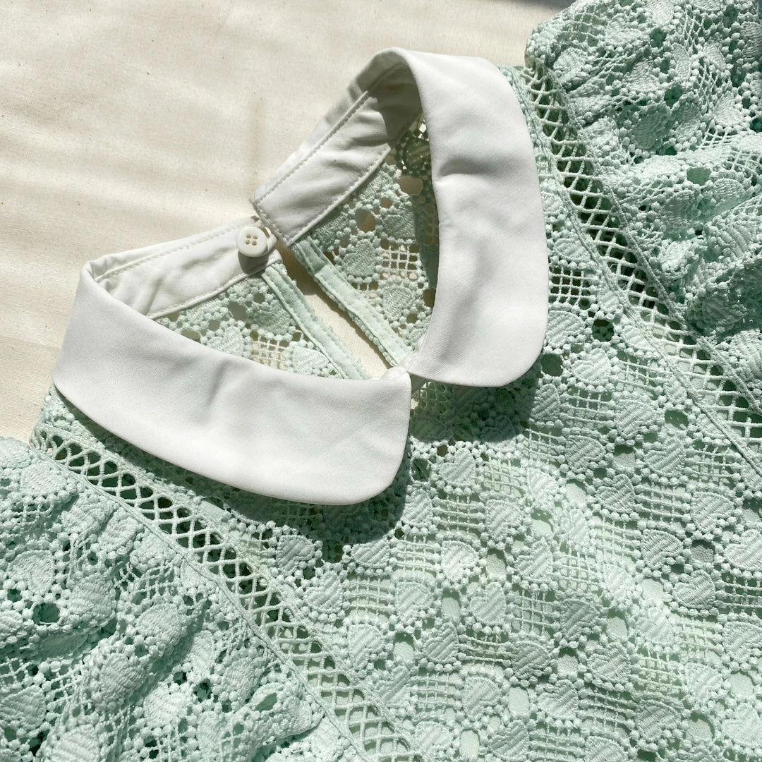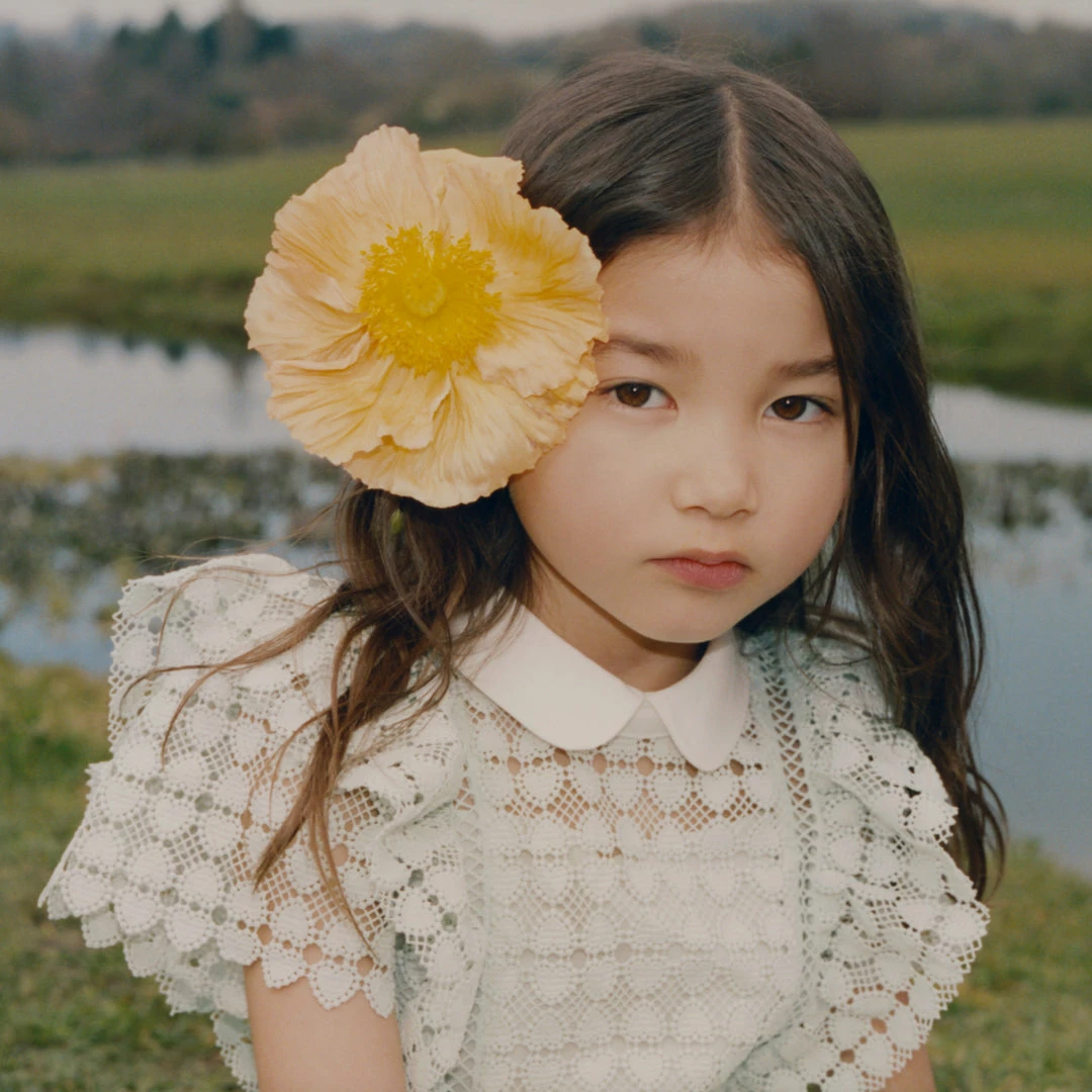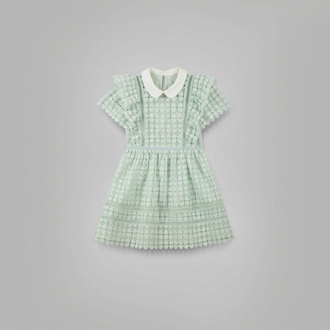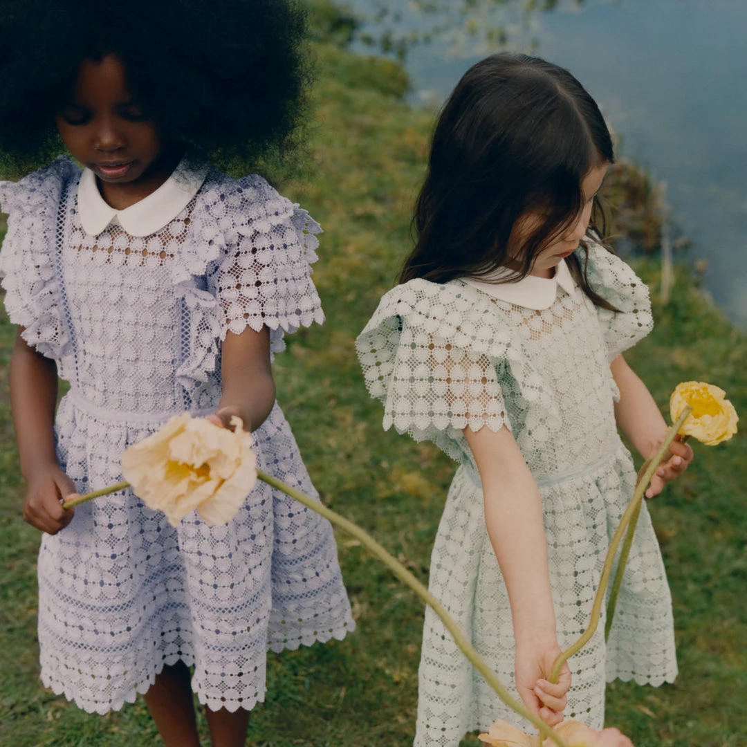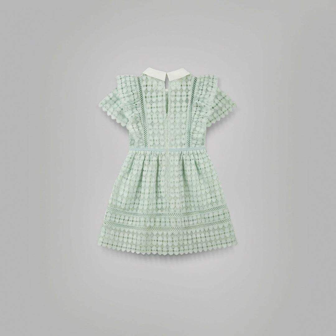 This kids mini dress is cut from our signature mint heart guipure lace and features a contrasting white peter pan collar and tonal lace trims. The style is fitted through bodice with voluminous frill details at the sleeves. The waist is elasticated with a tonal grosgrain trim and fastens with a back zip. Check the Size Guide to find your perfect fit.
