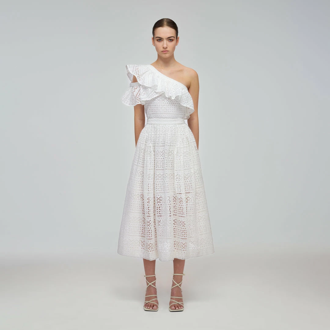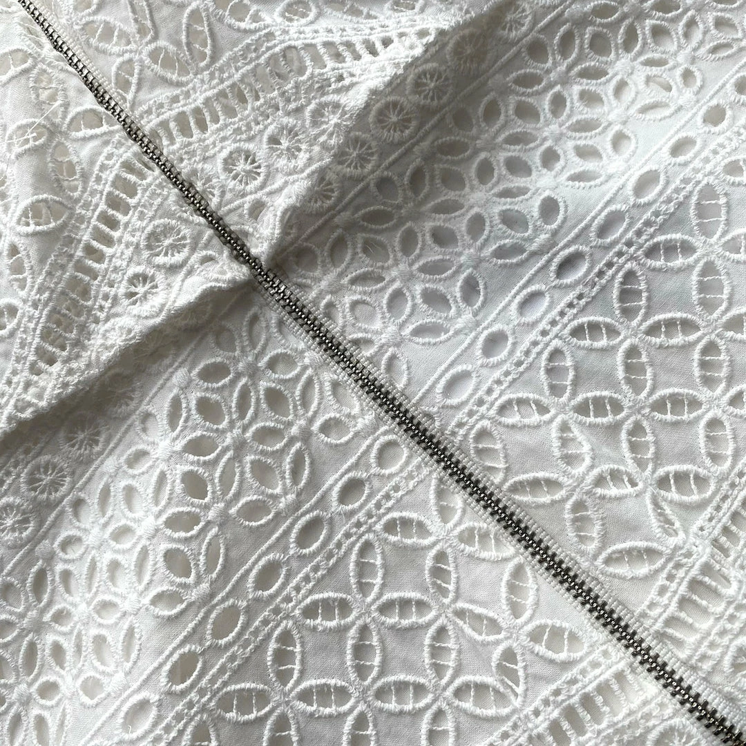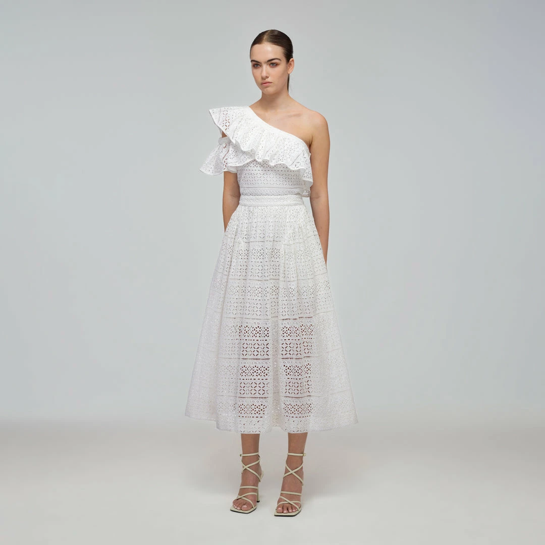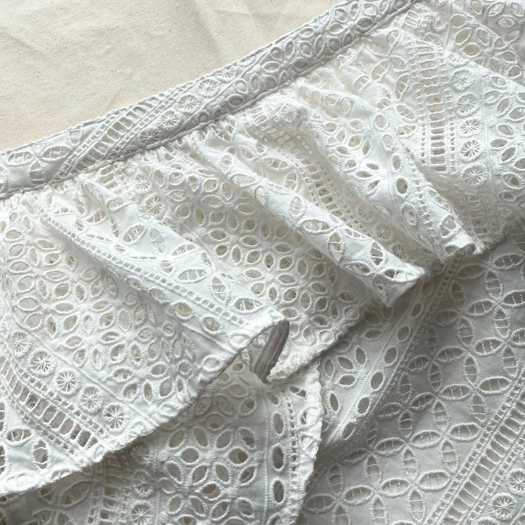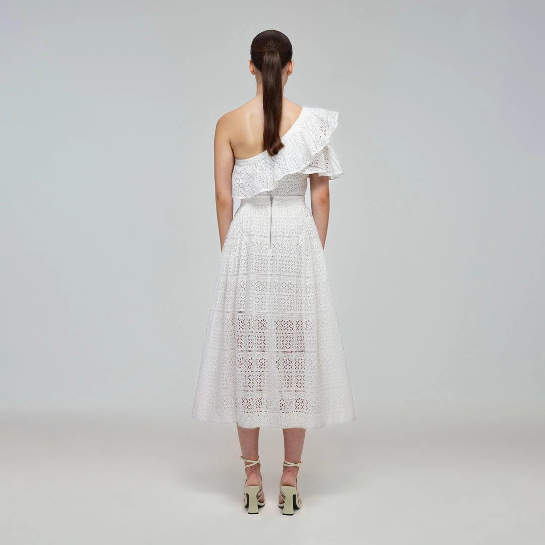 This white top is cut from cotton broderie. It is designed with an asymmetric neckline and frill detail. It fastens with an exposed side zip. Check the Size Guide to find your perfect fit.