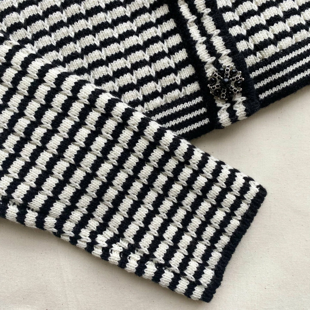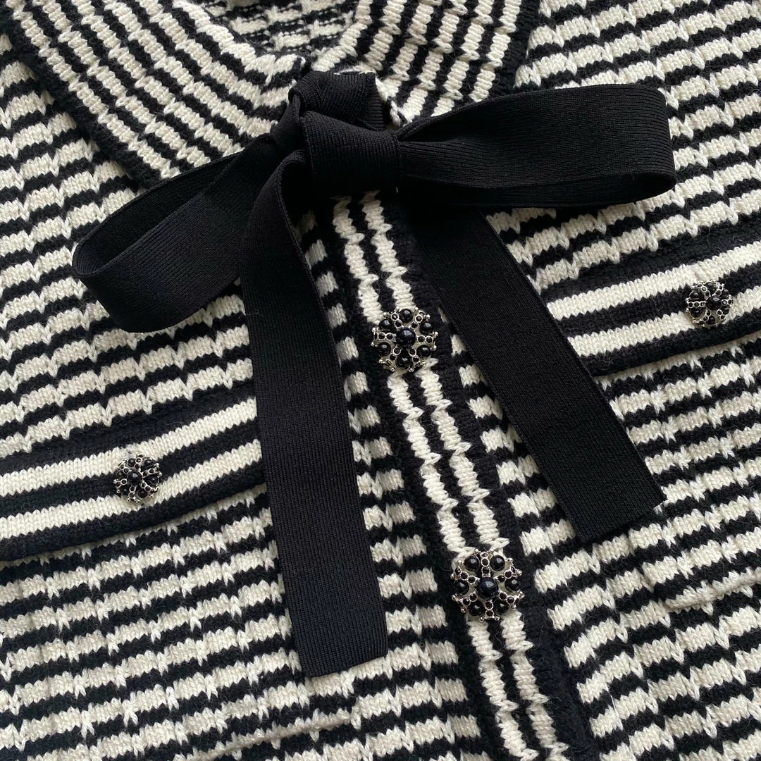 This monochrome stripe melange knit cardigan is designed with a collar at the neck finished with a pussy bow. It fastens at the front with floral diamante buttons. Check the Size Guide to find your perfect fit.