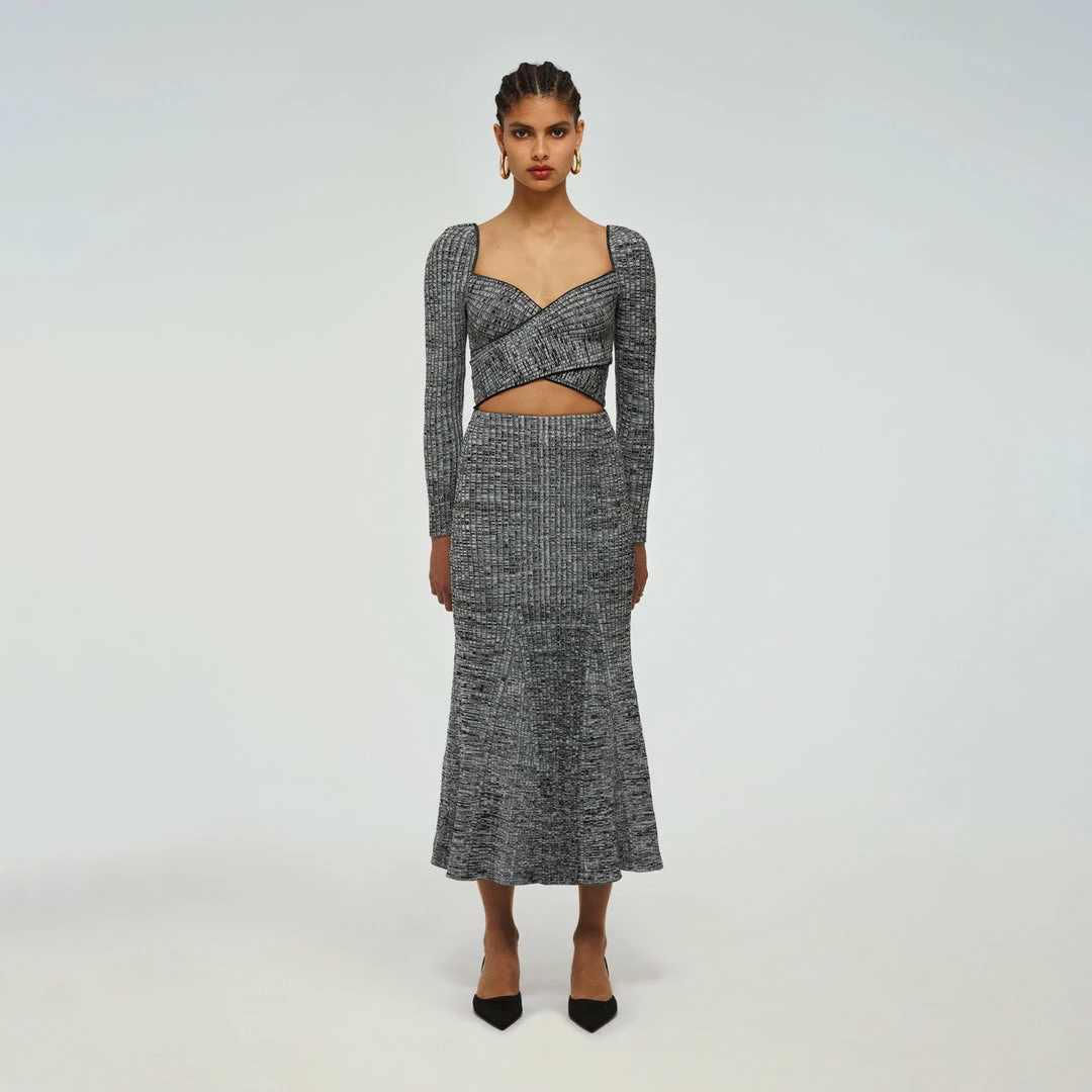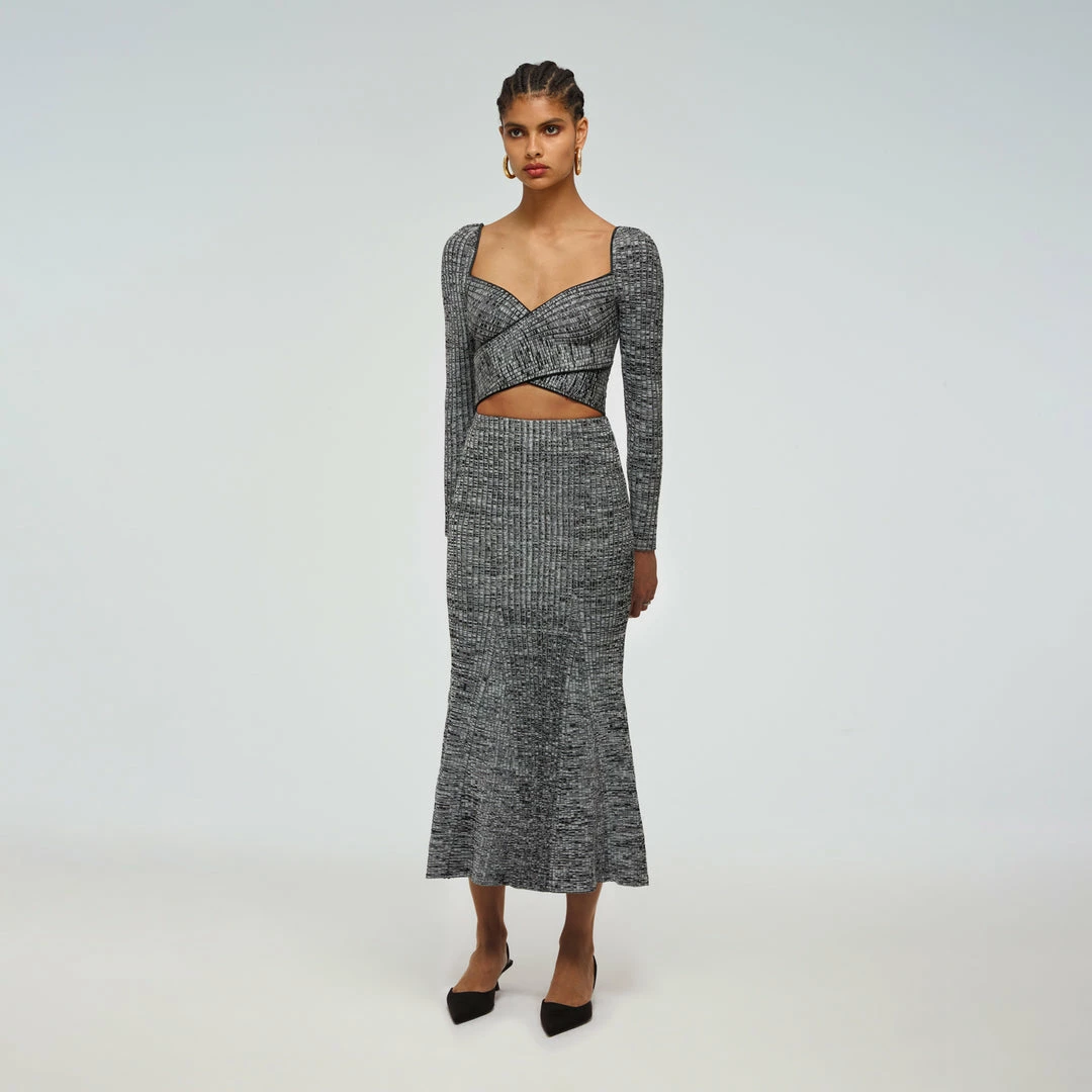 This space dye ribbed knit midi skirt falls to a fitted silhouette which sculpts the body and flares out at the hem. Check the Size Guide to find your perfect fit.