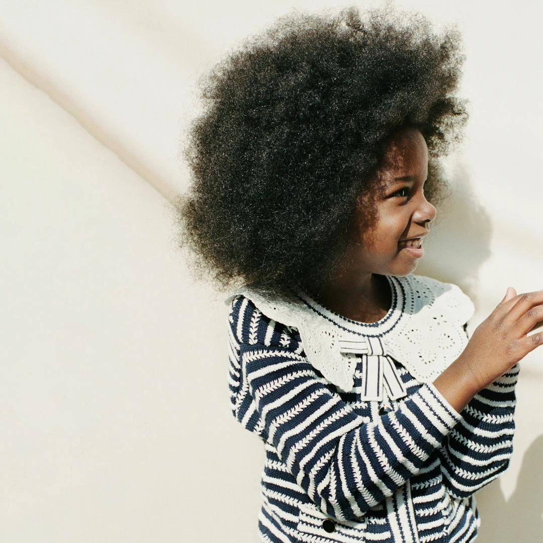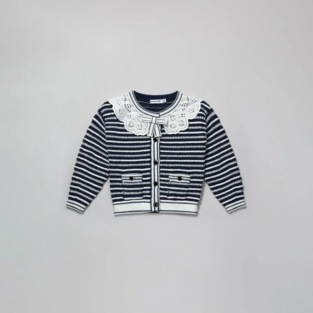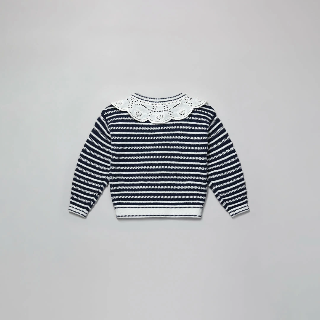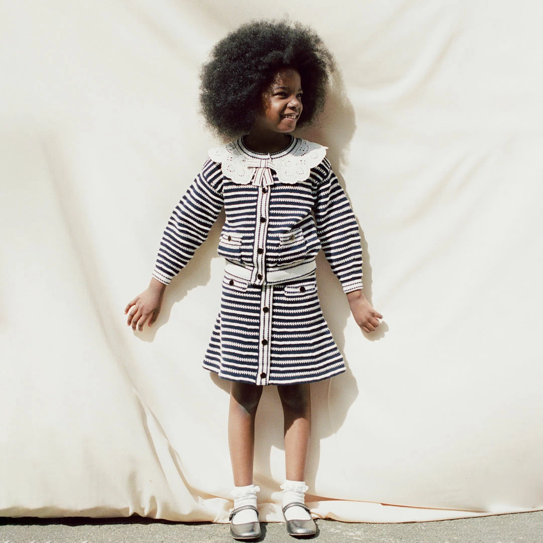A sweet broderie anglaise collar gives this knit cardigan a polished yet whimsical touch. Cut from a comfortable cotton wool blend, it’s adorned with gold buttons along the front and on its pockets, simply perfect for a day by the sea. Pair it with our matching skirt and trainers for a full nautical look. Check the Size Guide to find your perfect fit.
