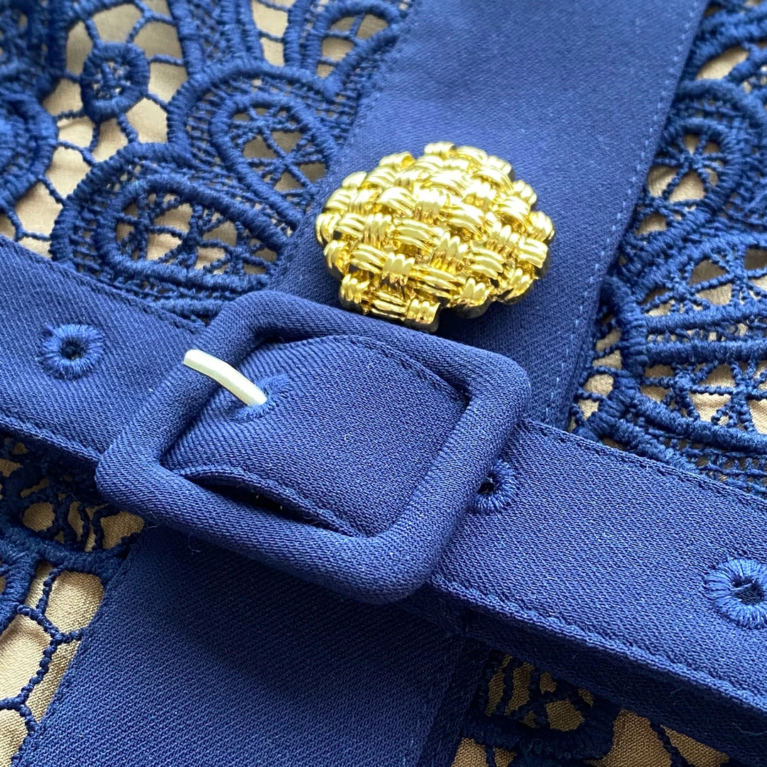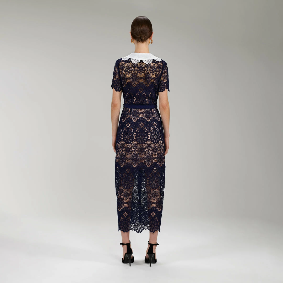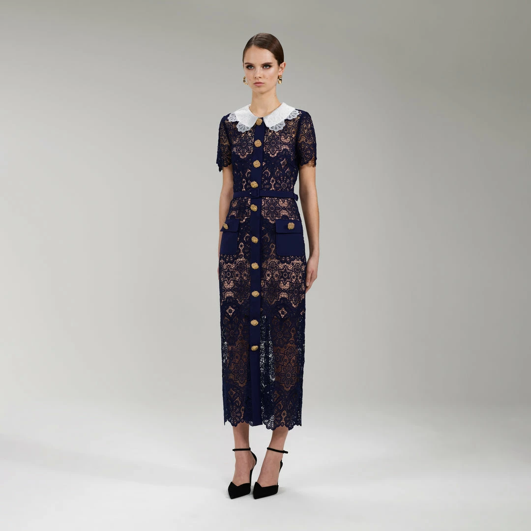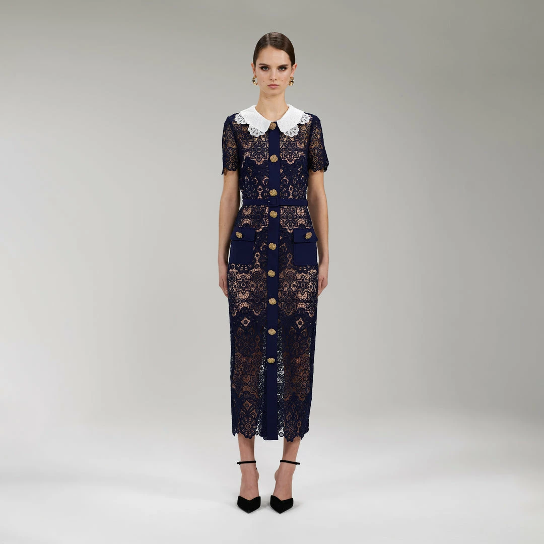 A statement lace collar is given pride of place on this navy midi dress, crafted from timeless floral guipure lace. Button fastenings down the front provide practicality as well as additional embellishment. A fitted waist and midi skirt add to a graceful, svelte silhouette — ideal for a work event, a smart dinner or the opening of a new exhibition. Check the Size Guide to find your perfect fit.