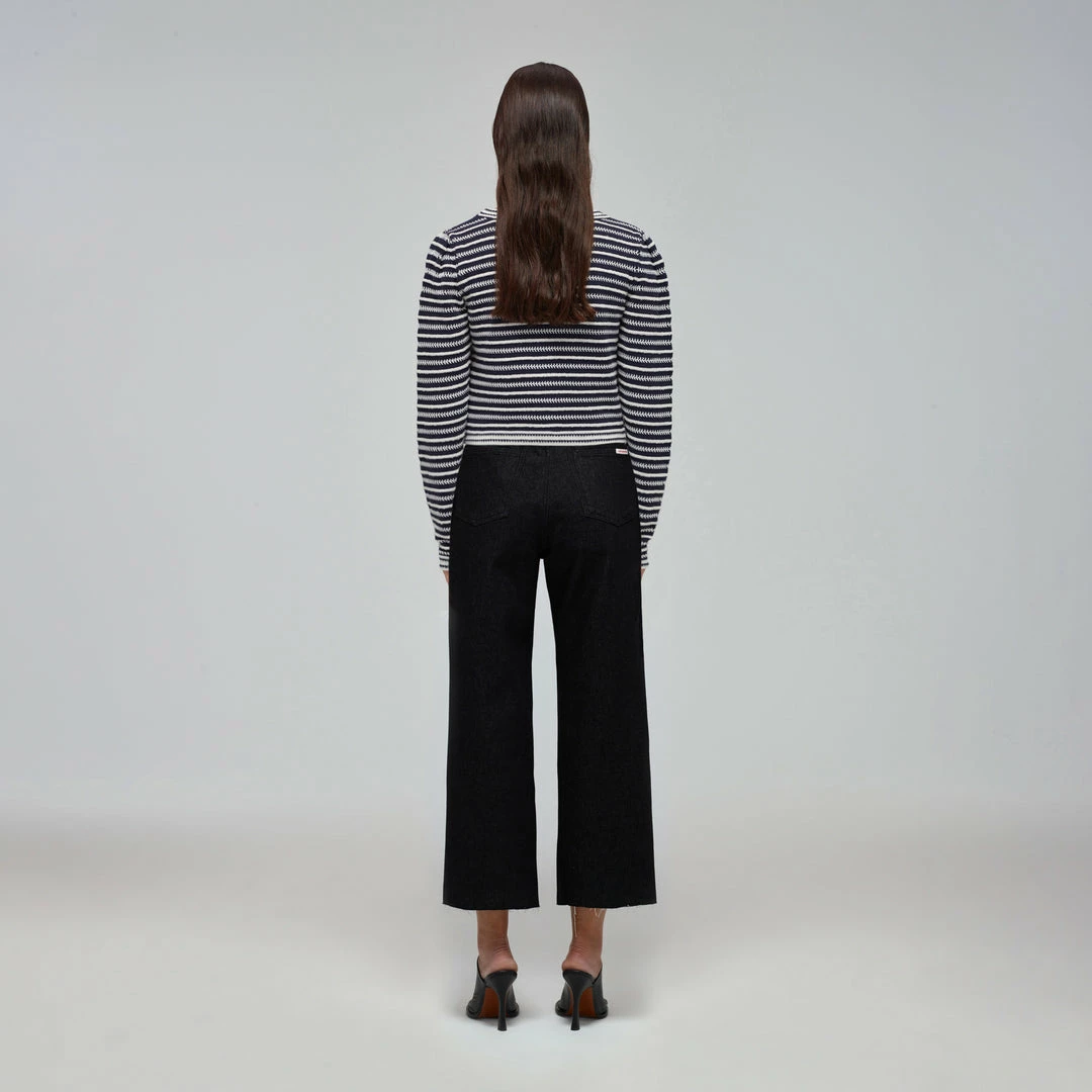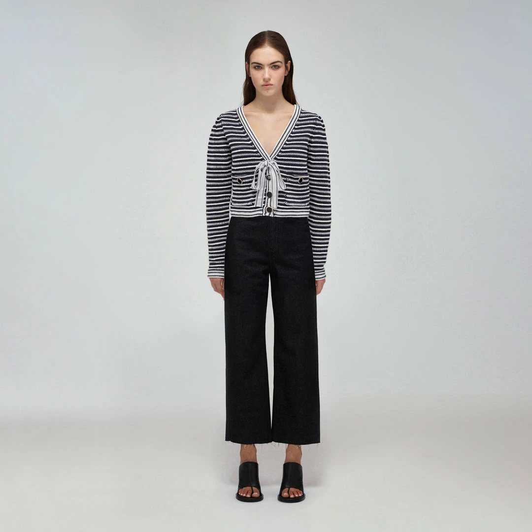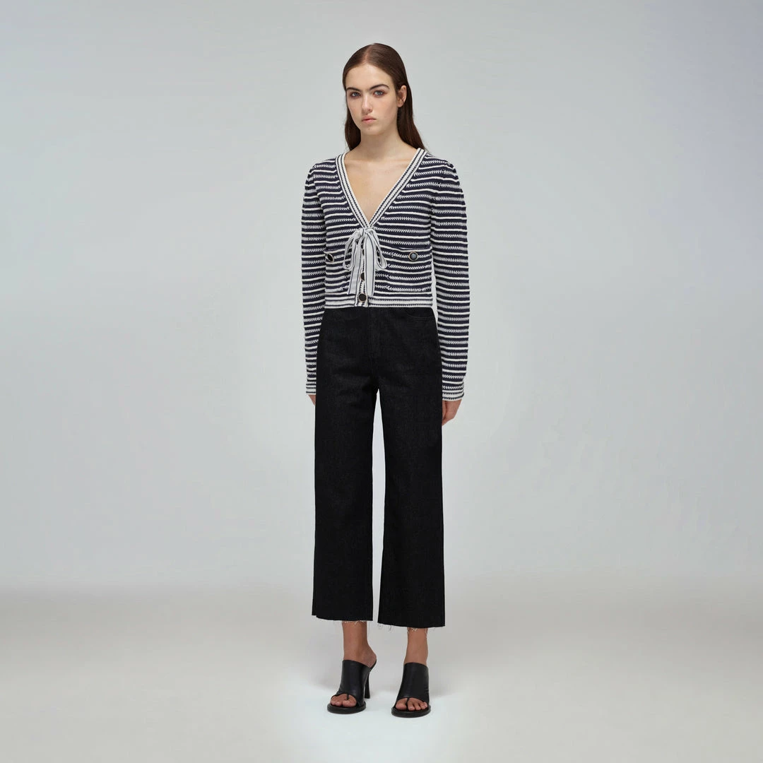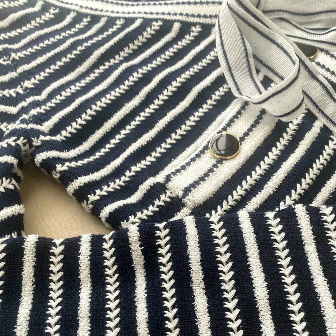 This navy and white rope knit cardigan is designed with a flattering v neckline finished with a pussy bow. It fastens at the front with black buttons. Check the Size Guide to find your perfect fit.