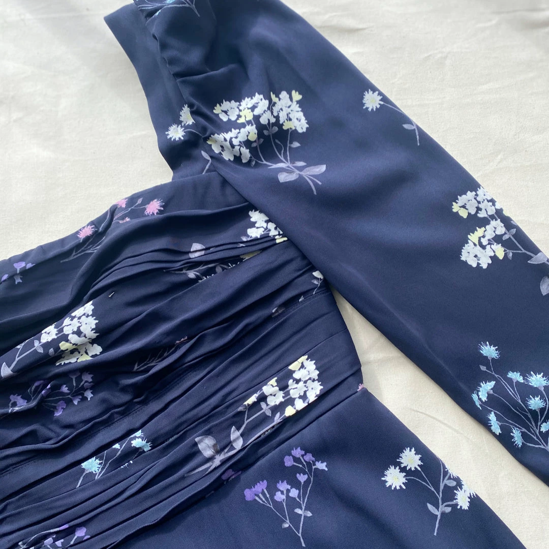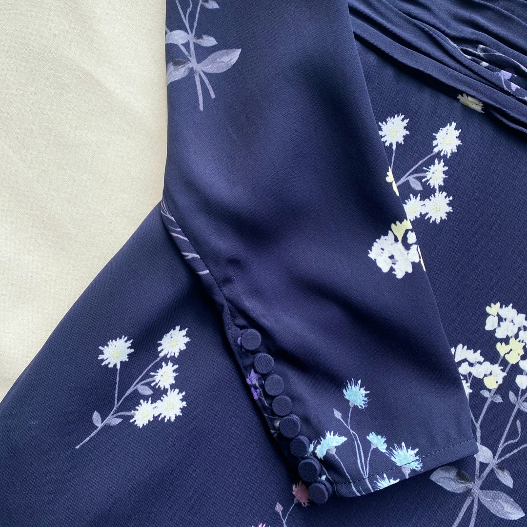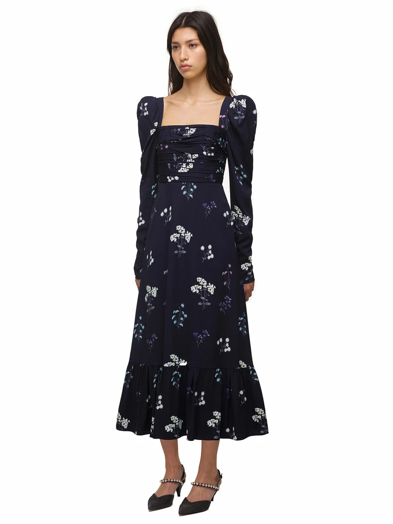 This midi dress is cut from navy vintage floral taffeta. Designed with a flattering square neckline and statement puff sleeves. Fitted with an elasticated waist it falls to a midi skirt with a frill hem. This style is lined with pockets. Check the Size Guide to find your perfect fit.
