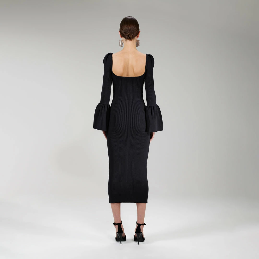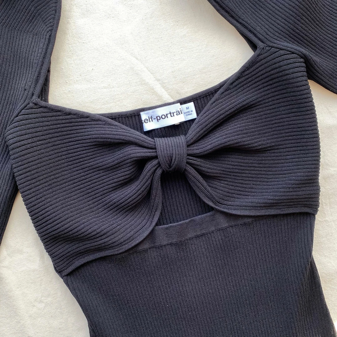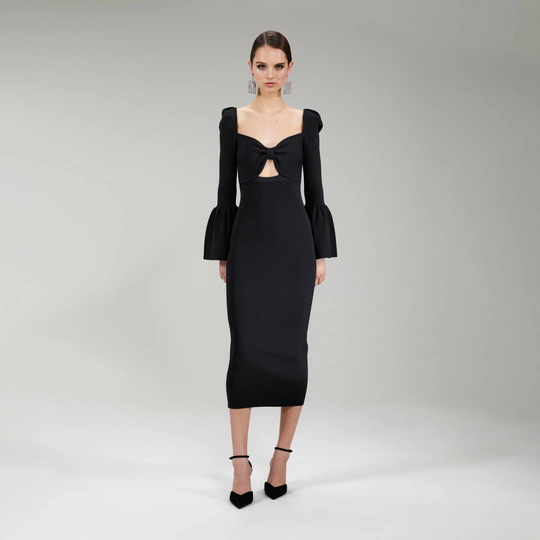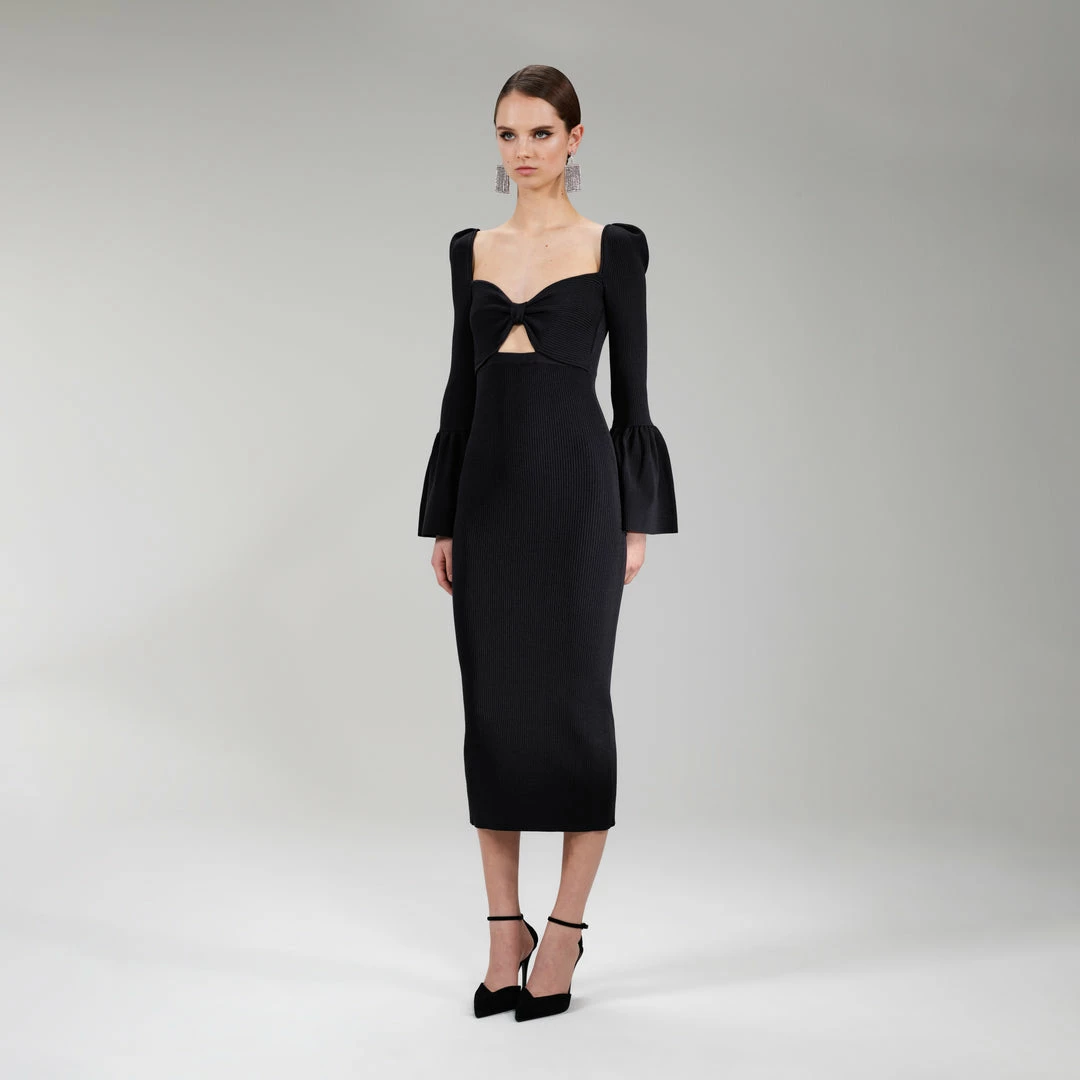 Self-portrait NEW ARRIVALS Black Ribbed Knit Bow Bust Midi Dress