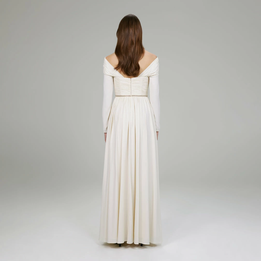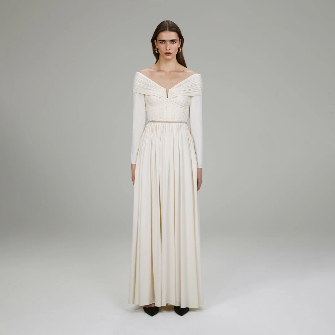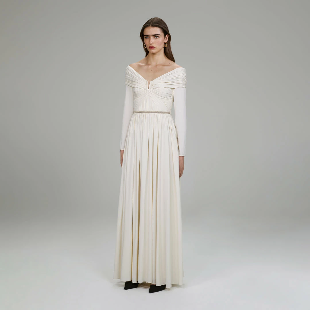 Cut from stretch crepe in a luscious shade of cream, this dress has a timeless yet modern silhouette. A notched neckline and off-shoulder pleating is contrasted with sheer sleeves, while a diamanté belt above a gathered maxi skirt is the icing on the cake. Pair it with diamond earrings and kitten heels for your next big night.