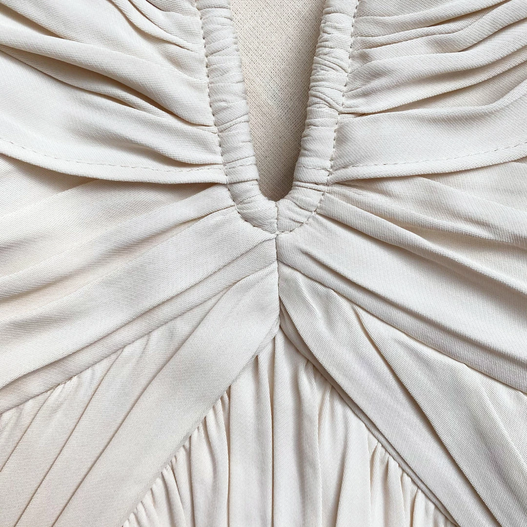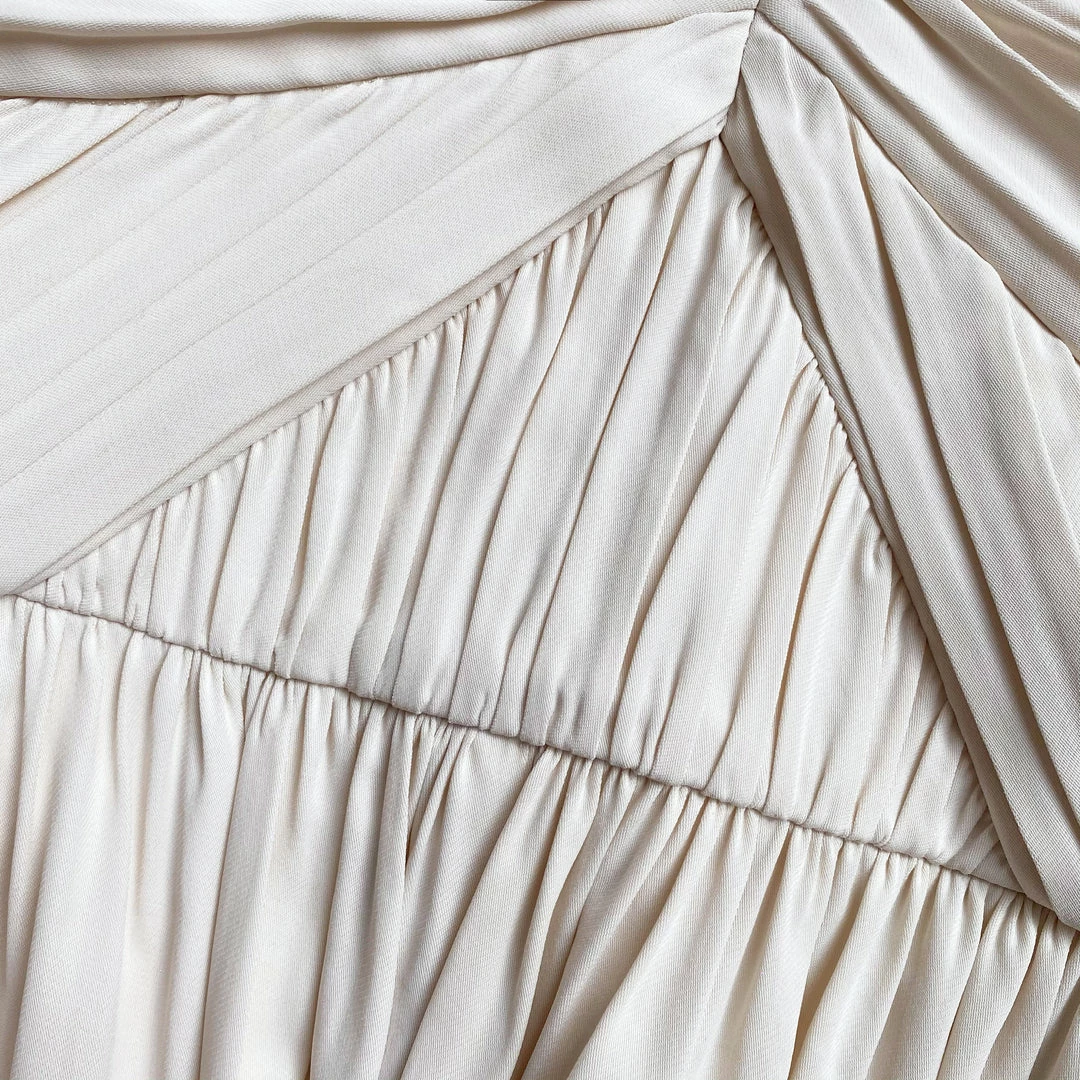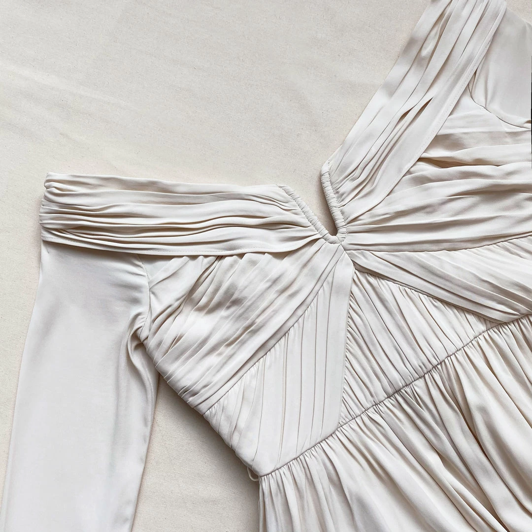 Cut from stretch crepe in a luscious shade of cream, this dress has a timeless yet modern silhouette. A notched neckline and off-shoulder pleating is contrasted with sheer sleeves, while a diamanté belt above a gathered maxi skirt is the icing on the cake. Pair it with diamond earrings and kitten heels for your next big night.