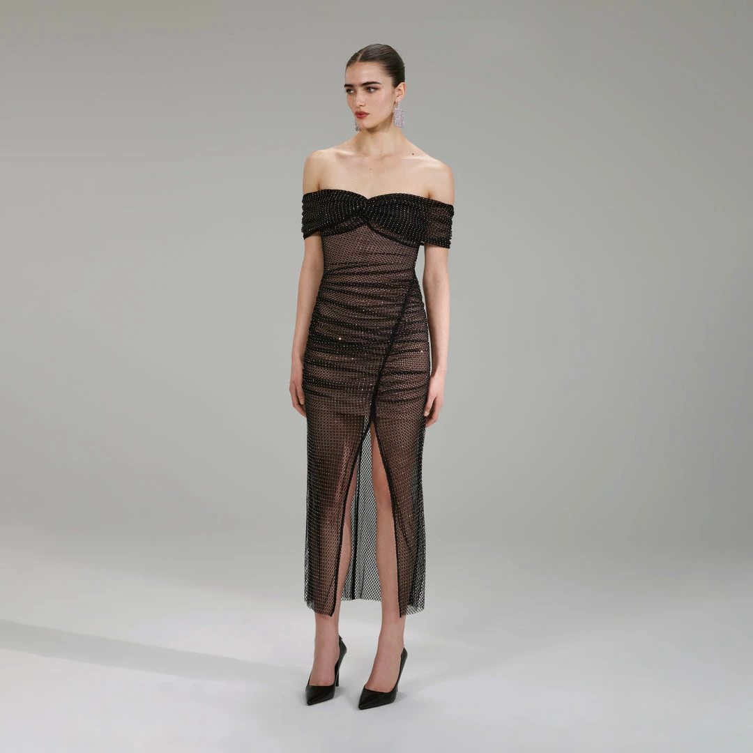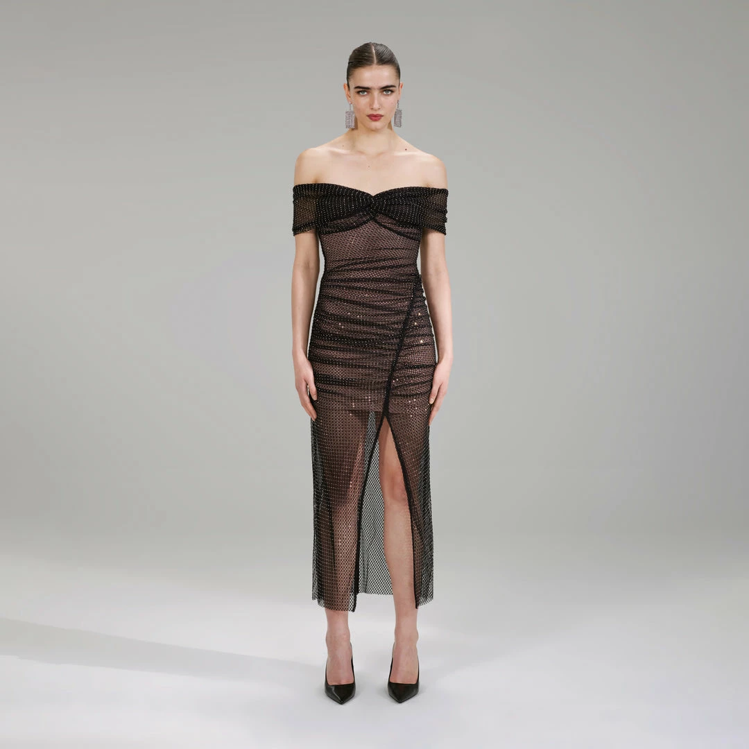 Self-portrait NEW ARRIVALS Diamante Fishnet Off Shoulder Midi Dress