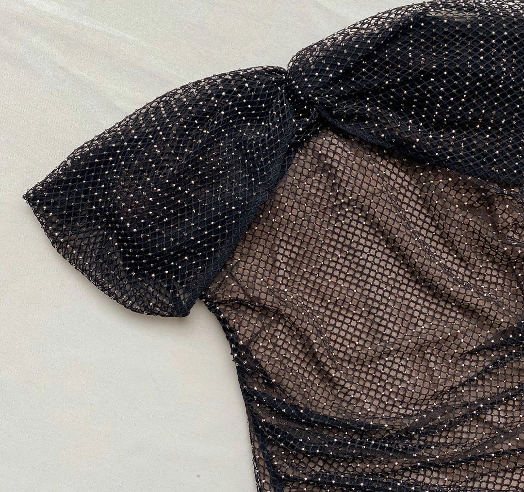 Cut from scene-stealing diamanté encrusted fishnet fabric, this midi dress is glamour personified. A foolproof off shoulder neckline flatters, while gathering throughout locks in an impeccable fit and a split skirt ensures ease. Channel a femme fatale and top it off with a red lip and stilettos.
