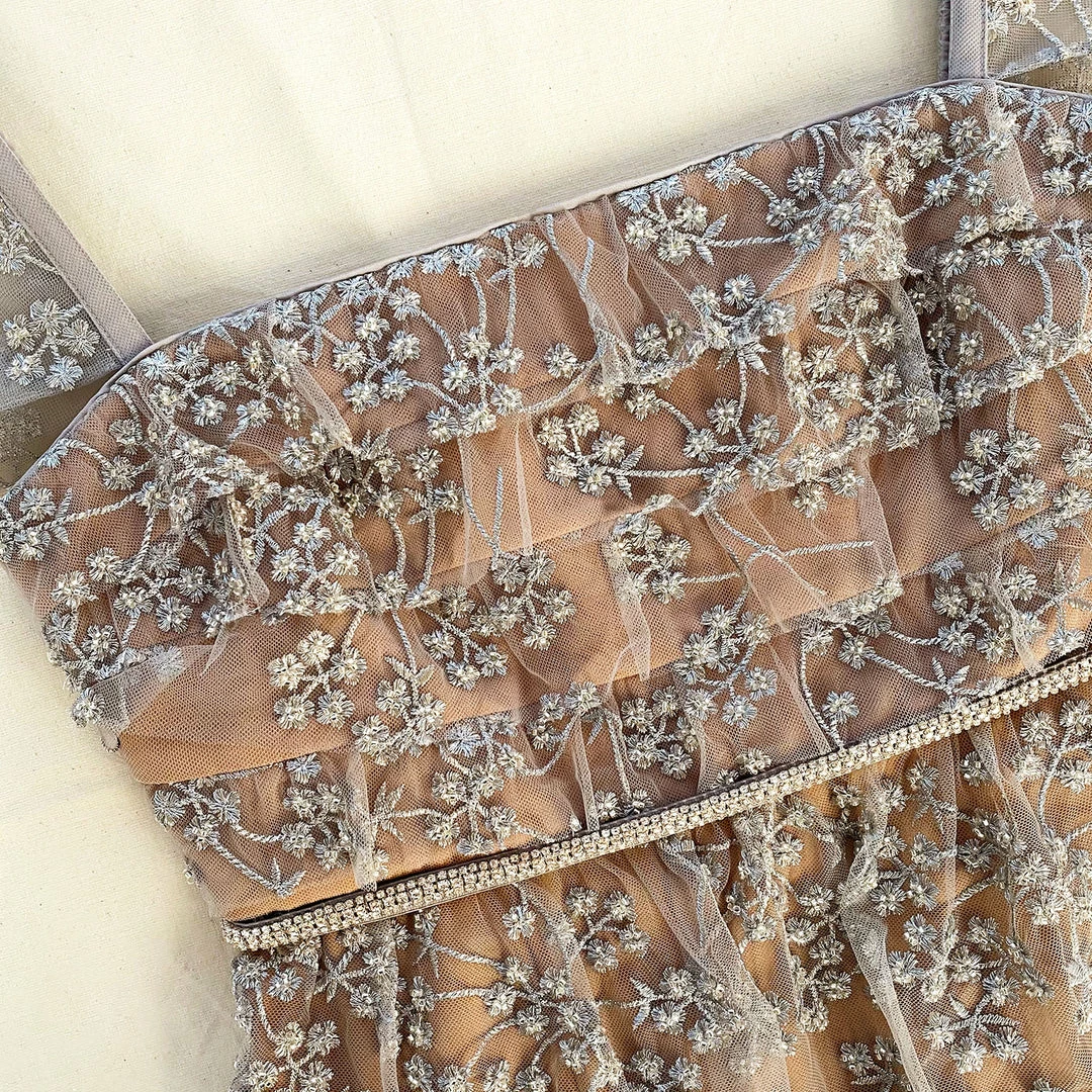 This mini dress couldn’t be more photo-ready, thanks to layers of embroidered silver floral mesh. Accented with cap sleeves and a suits-all square neckline, it promises to highlight your décolletage and elongate your legs. Pair it with platforms for a night on the town and hear the compliments roll in. Check the Size Guide to find your perfect fit.