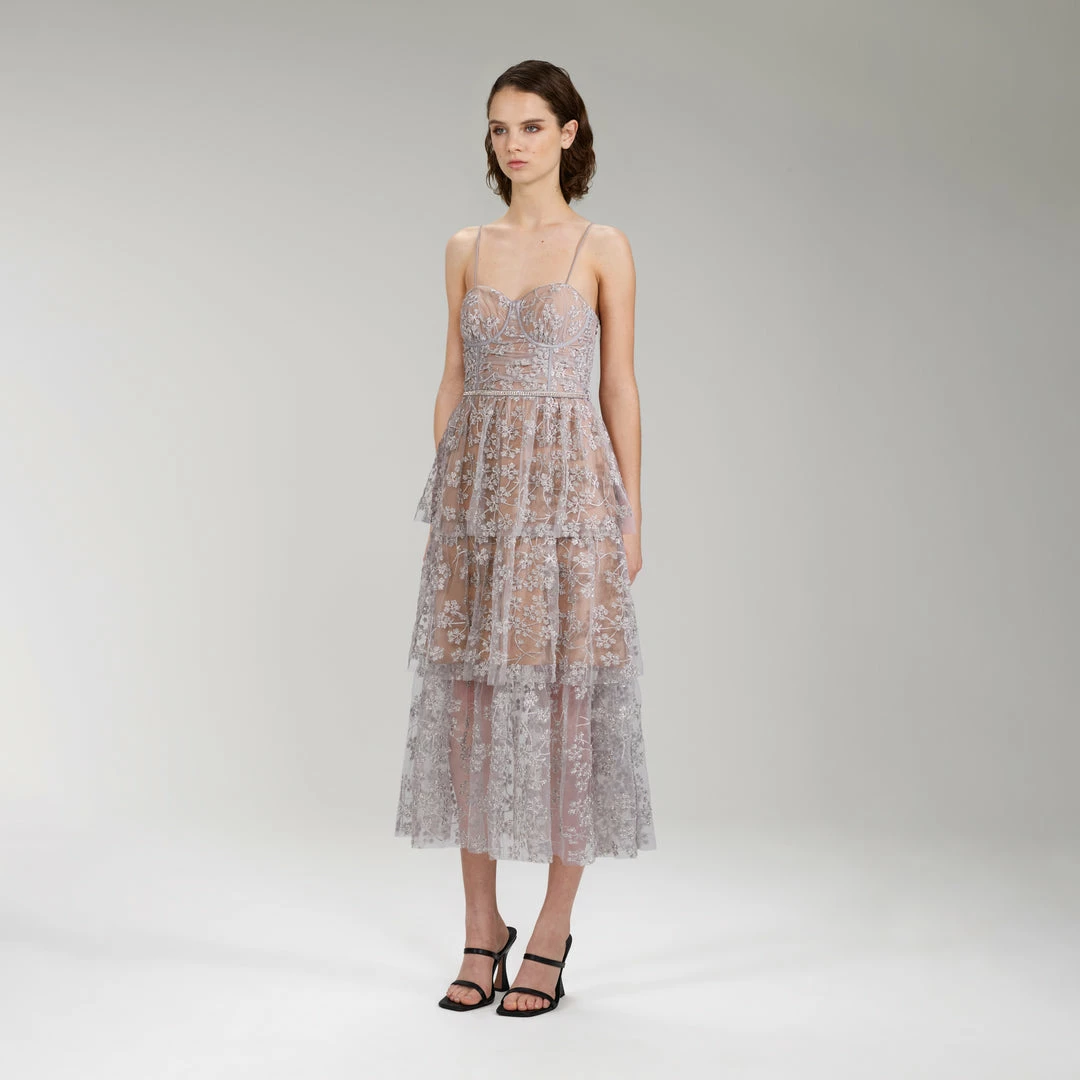 Channel icons of the silver screen with this sparkling number. Floral embroidery on lightweight mesh fabric gives the design an ethereal, dream-like finish. Paired with a corset top providing form-fitting support, a twirl-worthy midi skirt creates an exquisite silhouette. Stun your fellow attendees at your next party – wear it with nude heels and let the dress do the talking. Check the Size Guide to find your perfect fit.