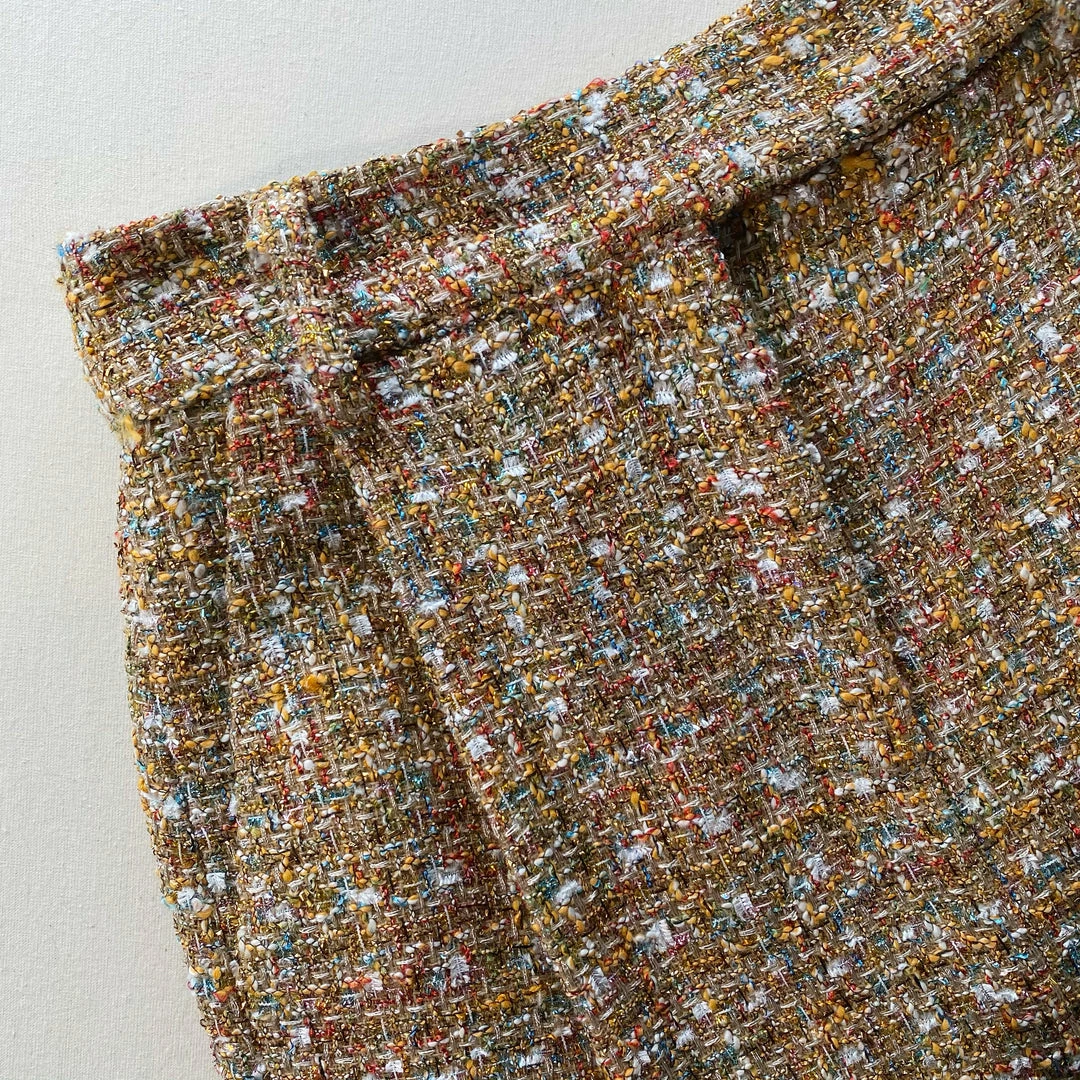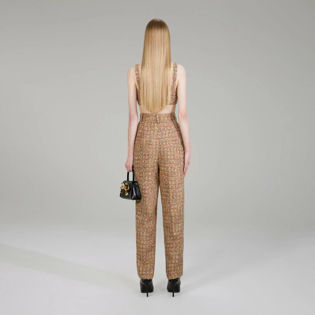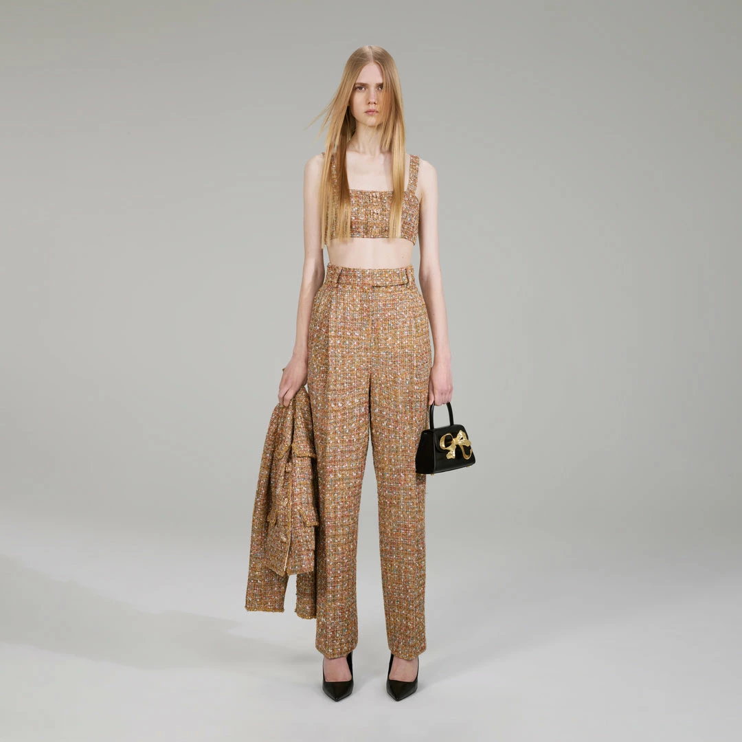 Dress for your golden age in these scene-stealing trousers, cut from gold tinsel bouclé for a dazzling finish. A high-waisted fit cinches the waist, while a loose, tapered fit shapes the silhouette with ease. Wear them to a night of karaoke or your next holiday soirée with stilettos and oversized silk button-up — plus plenty of gold jewellery for good measure.