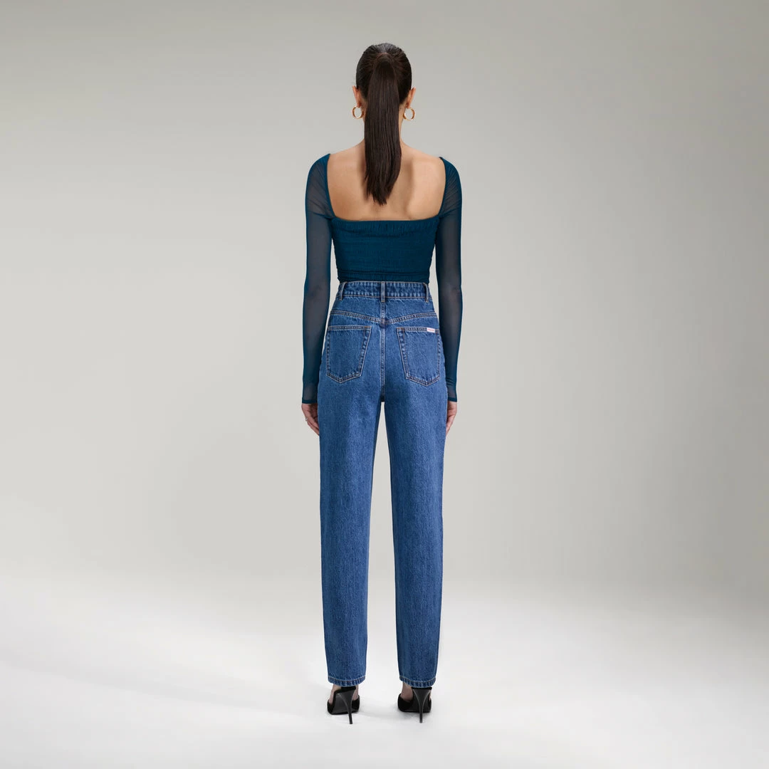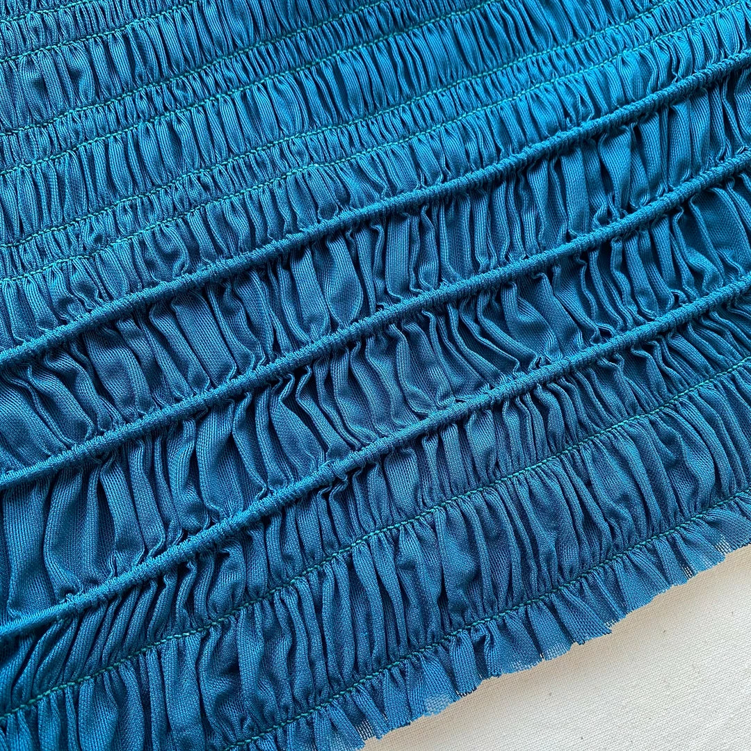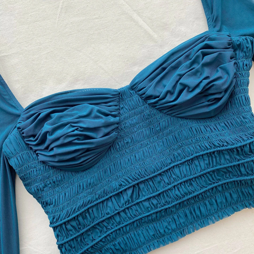 Shirred mesh gives this sultry teal top its stretchy form-fitting silhouette, which is further accented by semi-sheer sleeves and a flattering sweetheart neckline. Tuck it into an A-line midi skirt for a romantic cocktail ensemble, and pair it with high-waisted culottes for a work-ready look. Check the Size Guide to find your perfect fit.