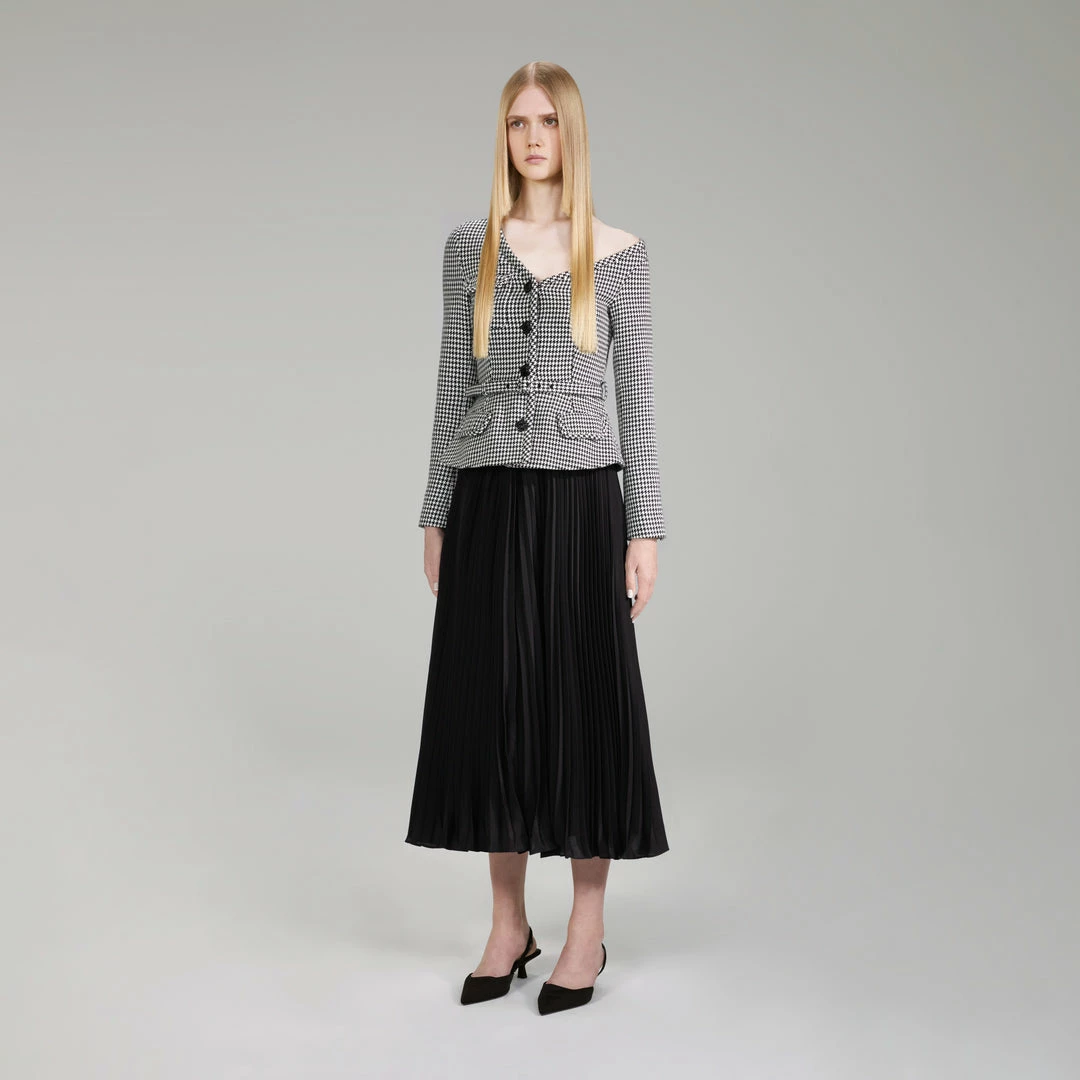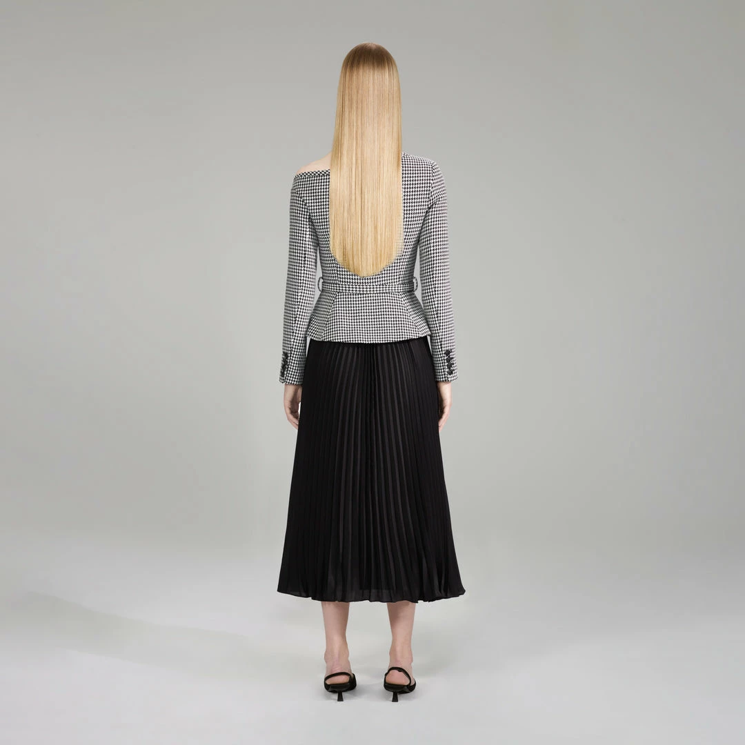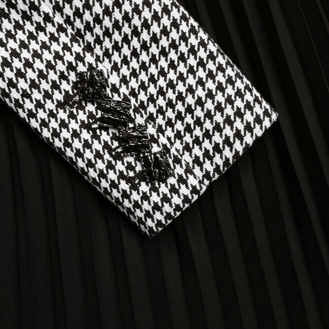 Classically polished houndstooth and dreamy chiffon join forces for this all-in-one midi dress, which features a tailored blazer top and flowing pleated skirt. An asymmetrical off shoulder design and gold buttons make an edgy statement, while a fabric belt cinches the waist for a feminine silhouette. Pair yours with kitten heels for a work event where you intend on making an impression.