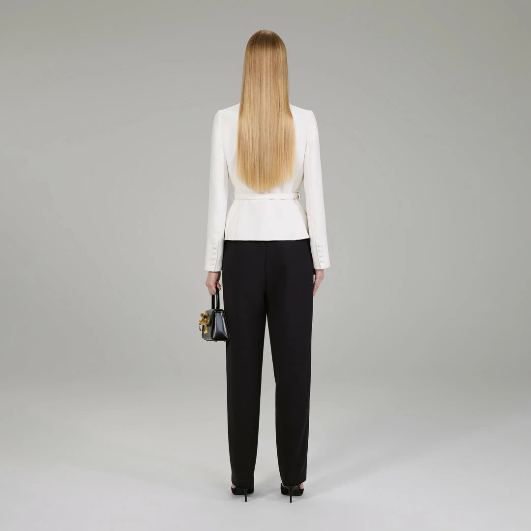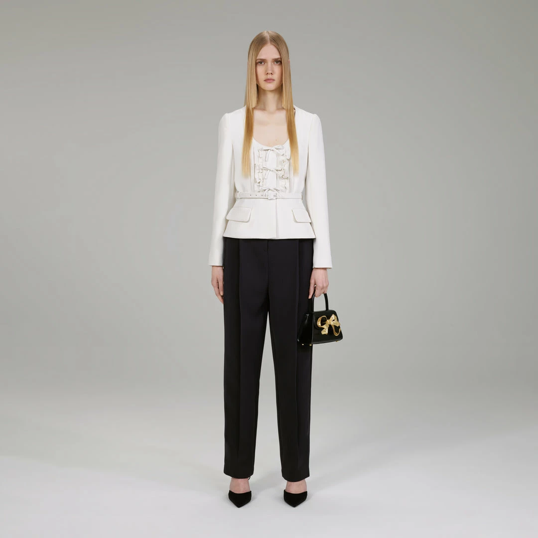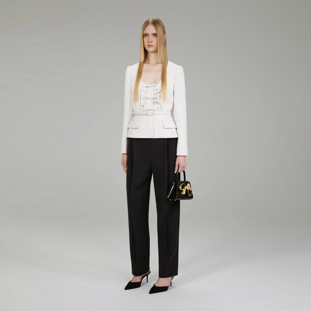 Cut from heavy crepe for its clean lines and structural feel, this ivory number is both a lightweight jacket and flattering top. A scoop neckline and belted peplum silhouette were designed to accentuate your curves, while frills and bow trims adorn its bodice. Pair it with your favourite jeans and flats for a polished daytime look, and switch to a pencil skirt and pumps for a dressed-up dinner party.