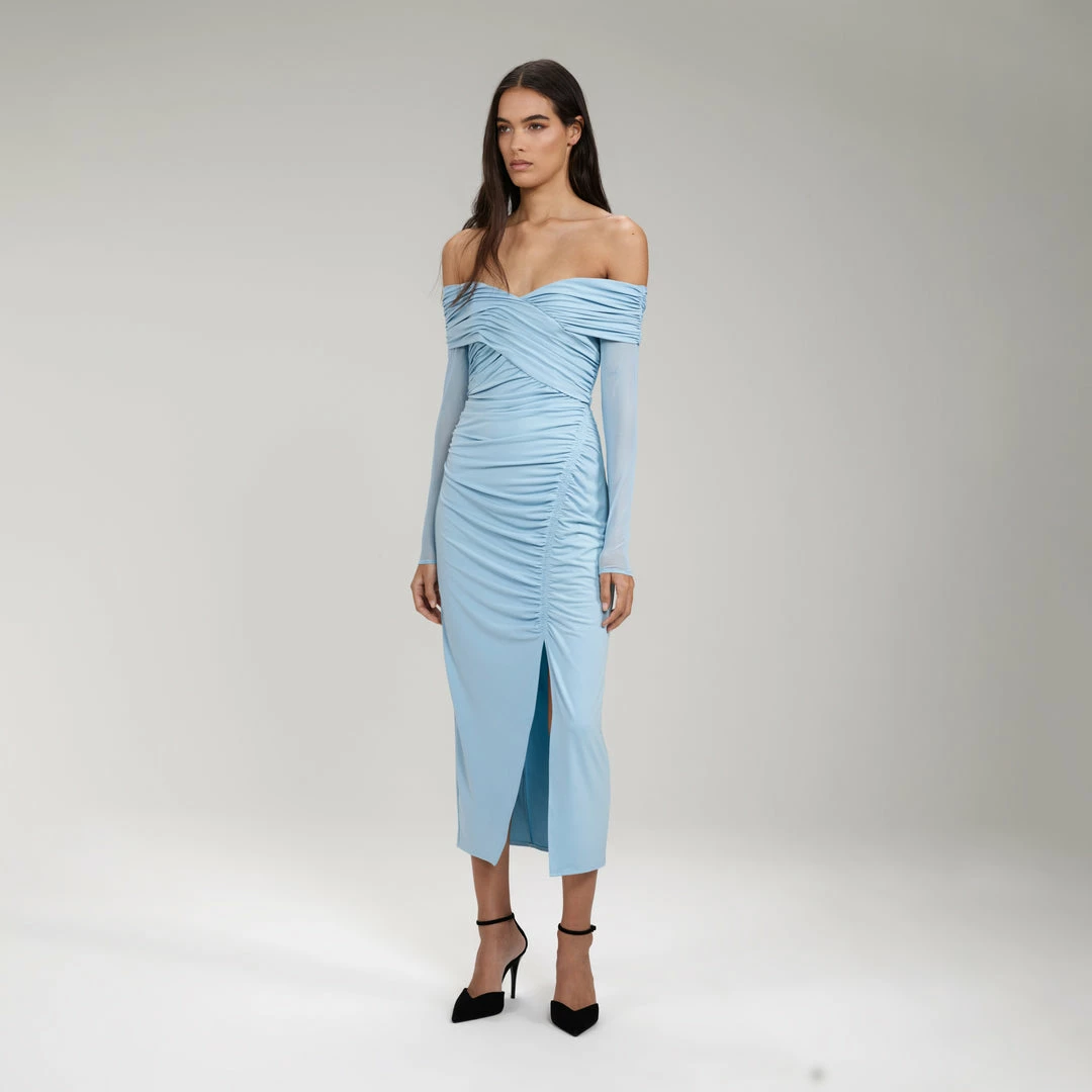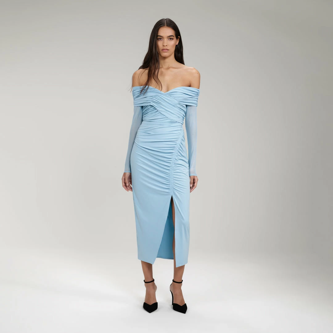 Equal parts comfort and style, the heavy jersey of this off shoulder midi dress was chosen for its body-hugging, fluid fit. Designed with a flattering wrap-around bodice and ruching throughout, it has a front split for ease of movement. Pair it with your favourite necklace at your next soirée to further highlight your décolletage. Check the Size Guide to find your perfect fit.
