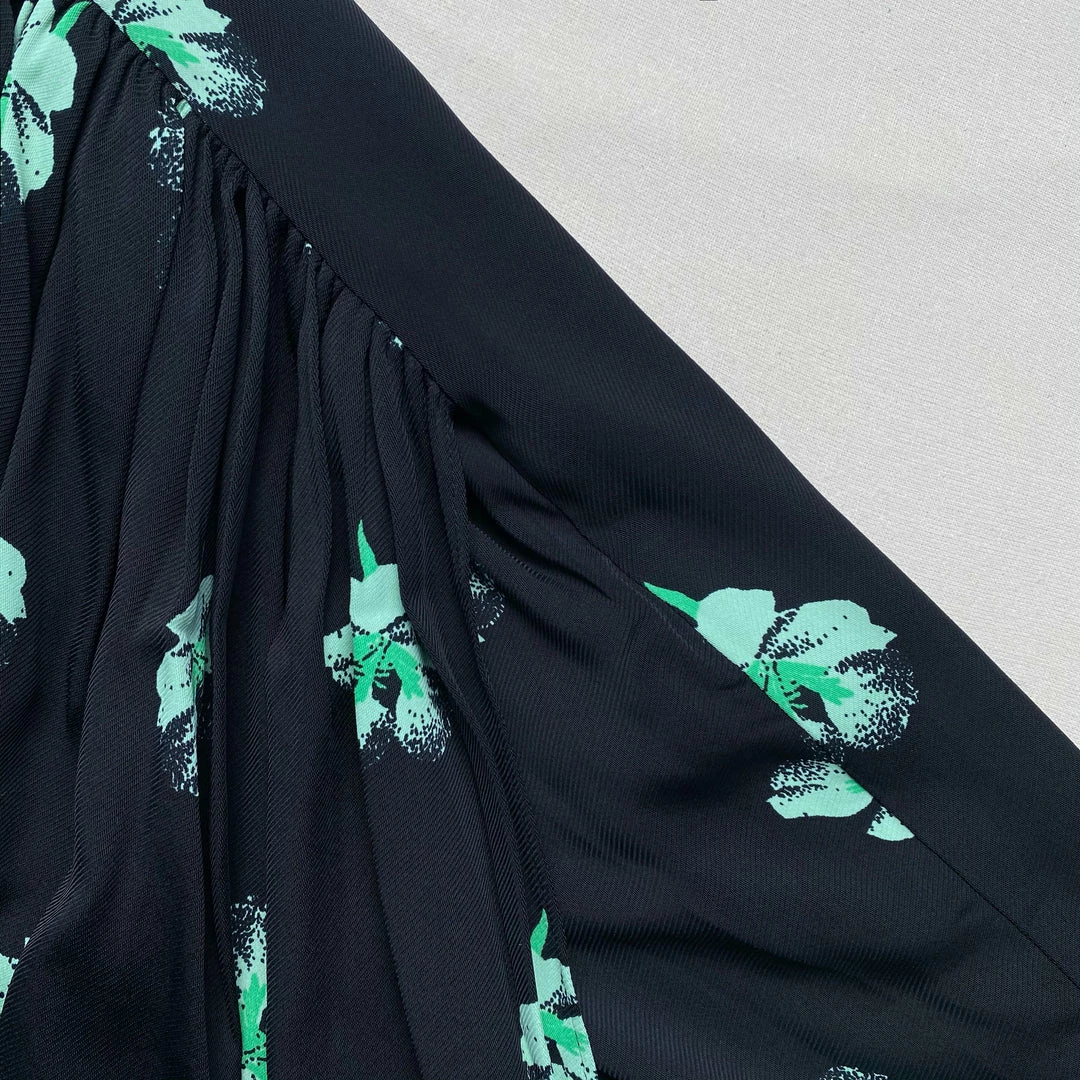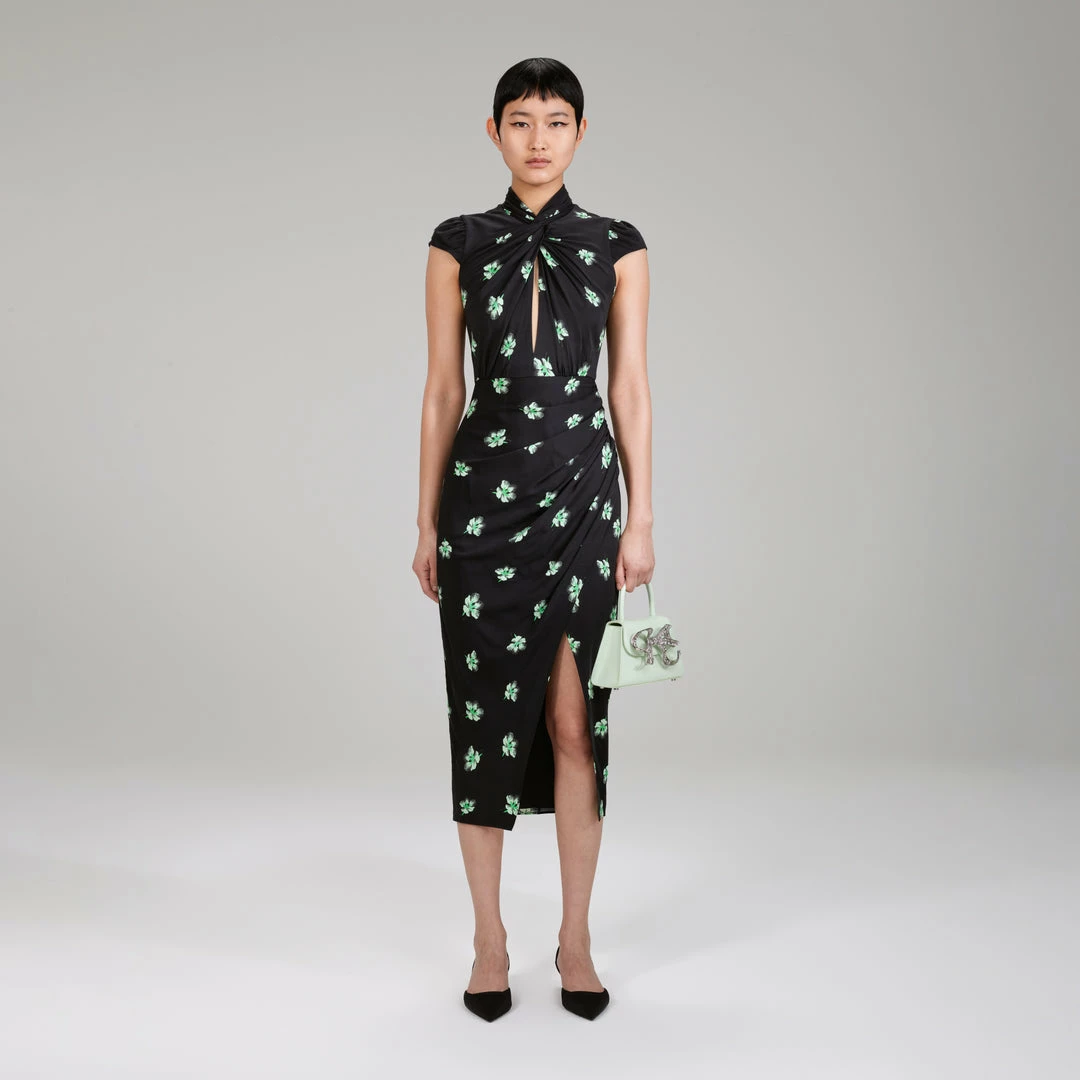 Draped to effortless perfection, this midi dress is cut from stretch pansy print crepe for a comfortable yet elegant fit. Cap sleeves and a high neckline — twisted to reveal a sultry keyhole at the bodice — form a timeless silhouette, which is finished off with a body-skimming wrap skirt. Style it with velvet platforms for a wedding, and pack it in your suitcase for a beachside getaway.