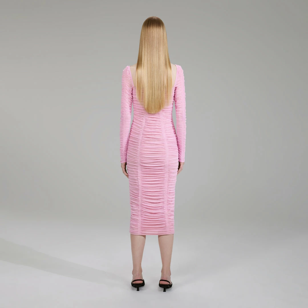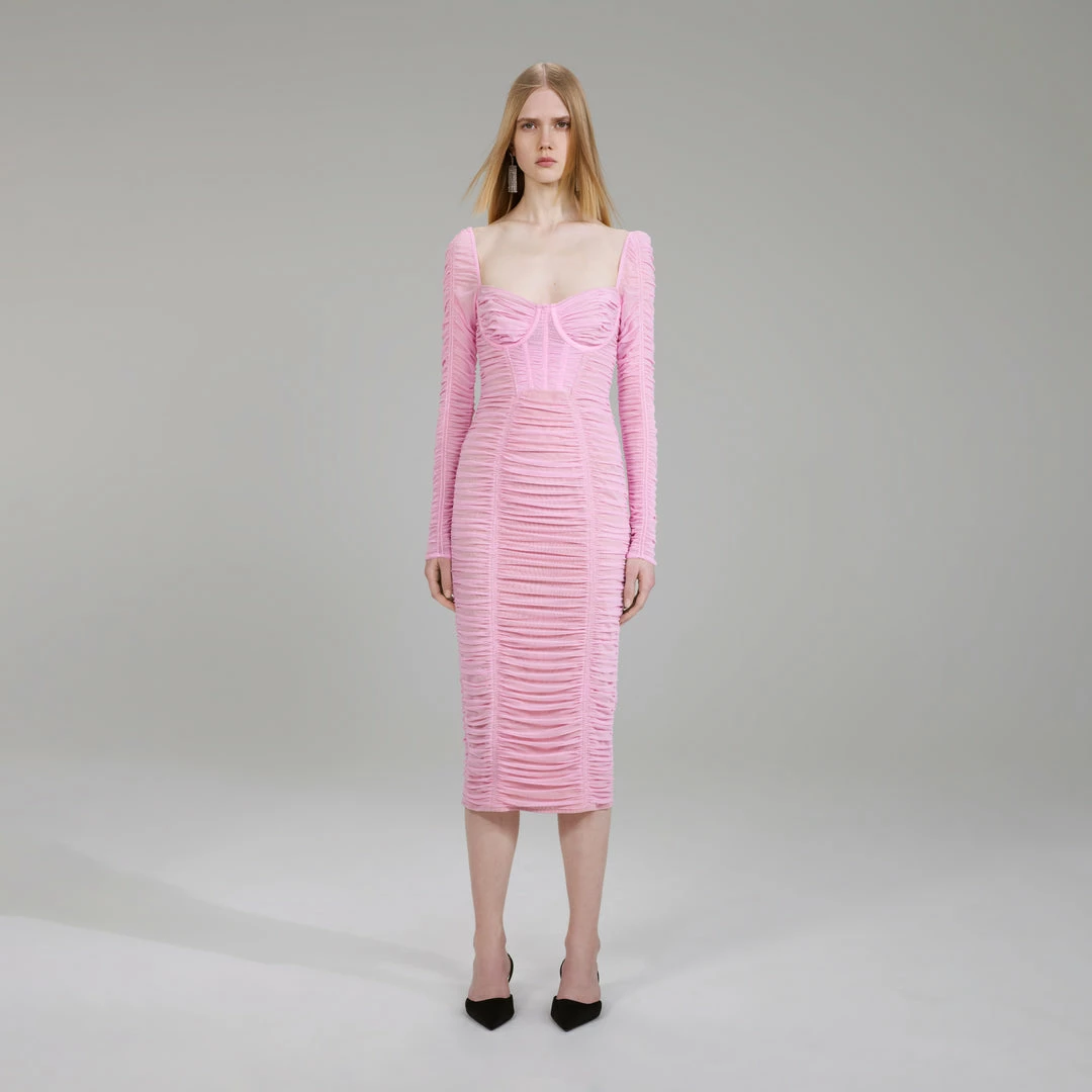 Self-portrait NEW ARRIVALS Pink Power Mesh Long Sleeve Midi Dress