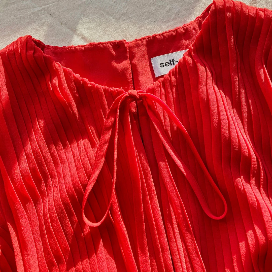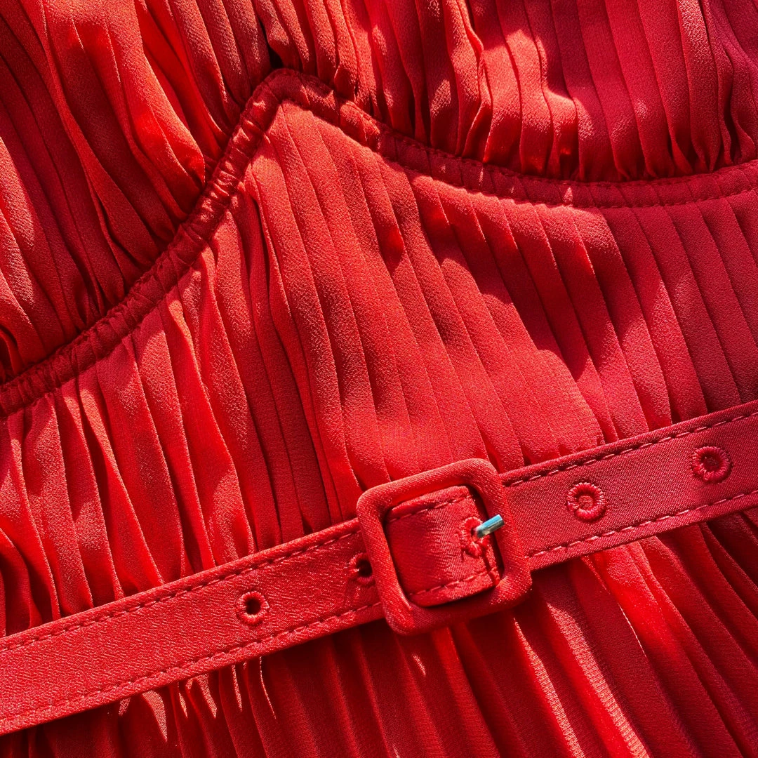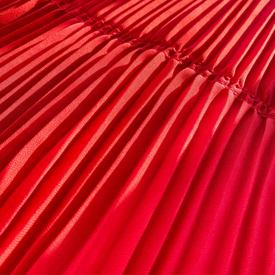 This midi dress is cut from red pleated recycled polyester. This style is designed with a fit and flare silhouette and a flattering split down the front neckline finished with a bow. Check the Size Guide to find your perfect fit.