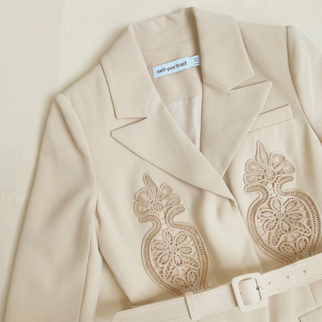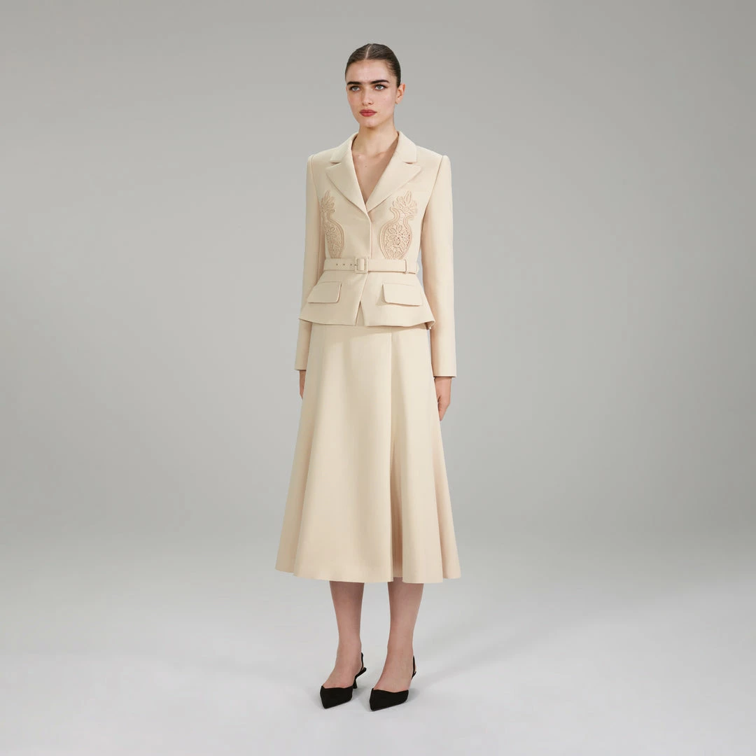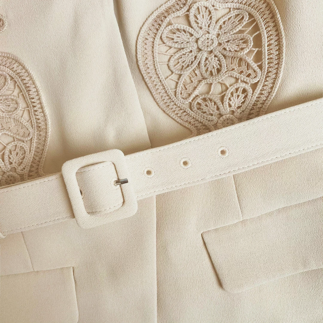 This cream midi dress is cut from heavy crepe. It is designed with a slim fitting silhouette and internal shoulder pads for a subtle structured form. The bodice is detailed with lace motifs and flap pockets. The waist is accentuated with a detachable self-fabric belt balanced with a flared hem skirt. This style is lined. Check the Size Guide to find your perfect fit.