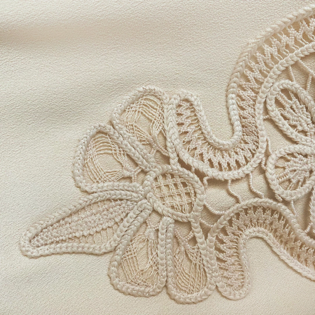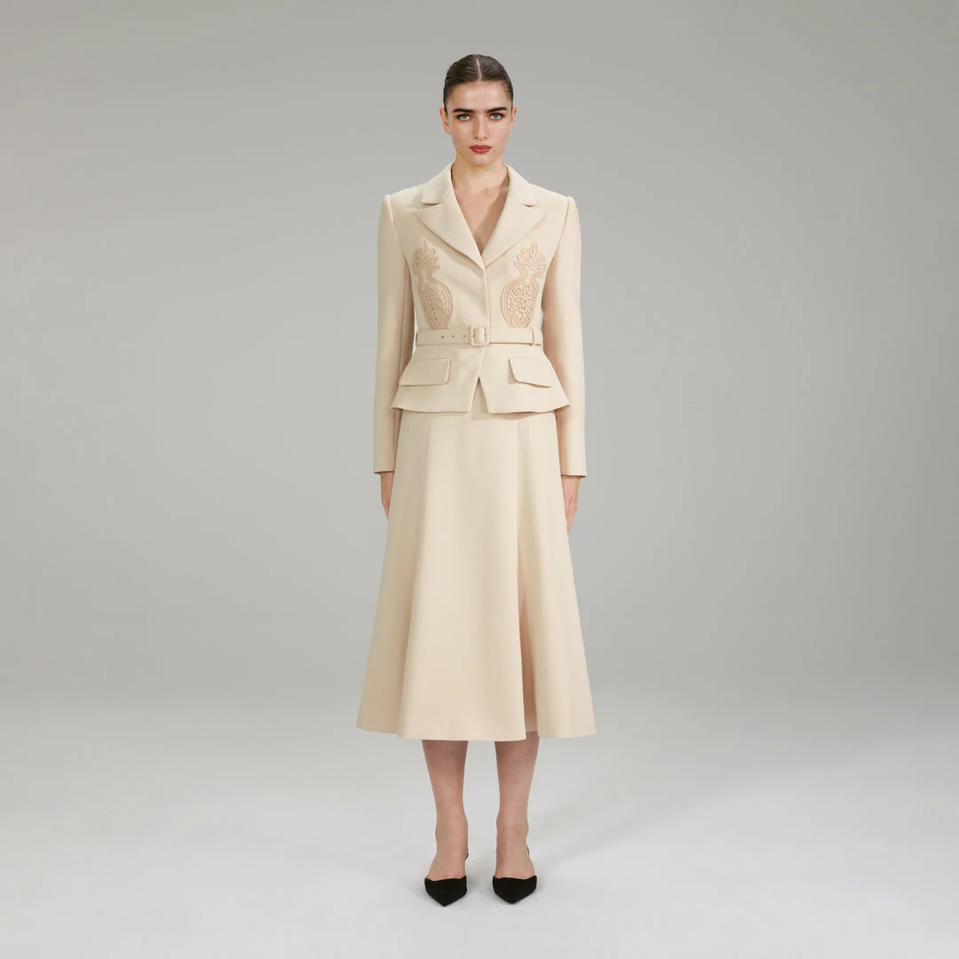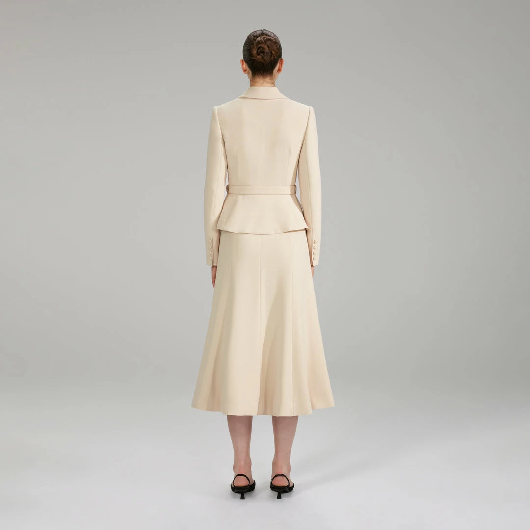 This cream midi dress is cut from heavy crepe. It is designed with a slim fitting silhouette and internal shoulder pads for a subtle structured form. The bodice is detailed with lace motifs and flap pockets. The waist is accentuated with a detachable self-fabric belt balanced with a flared hem skirt. This style is lined. Check the Size Guide to find your perfect fit.