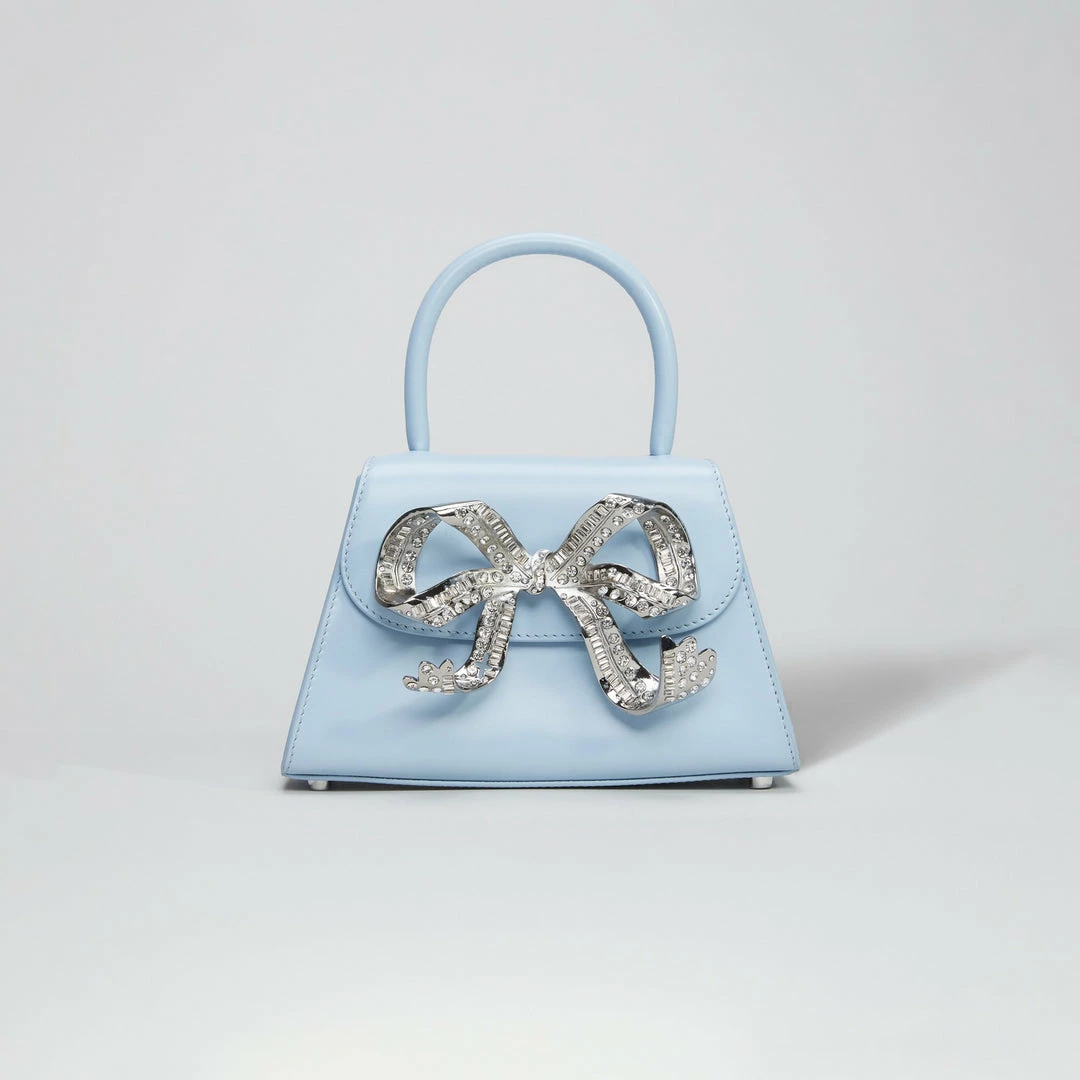 A breath of fresh air, The Bow in Light Blue is the bright spot in any day. Whether you save it for special occasions or use it to ornament everyday looks – the signature bow in diamanté is sure to draw compliments. Crafted entirely from Napa leather, the timeless silhouette features a top handle with a detachable shoulder strap and fastens with a magnetic flap closure.