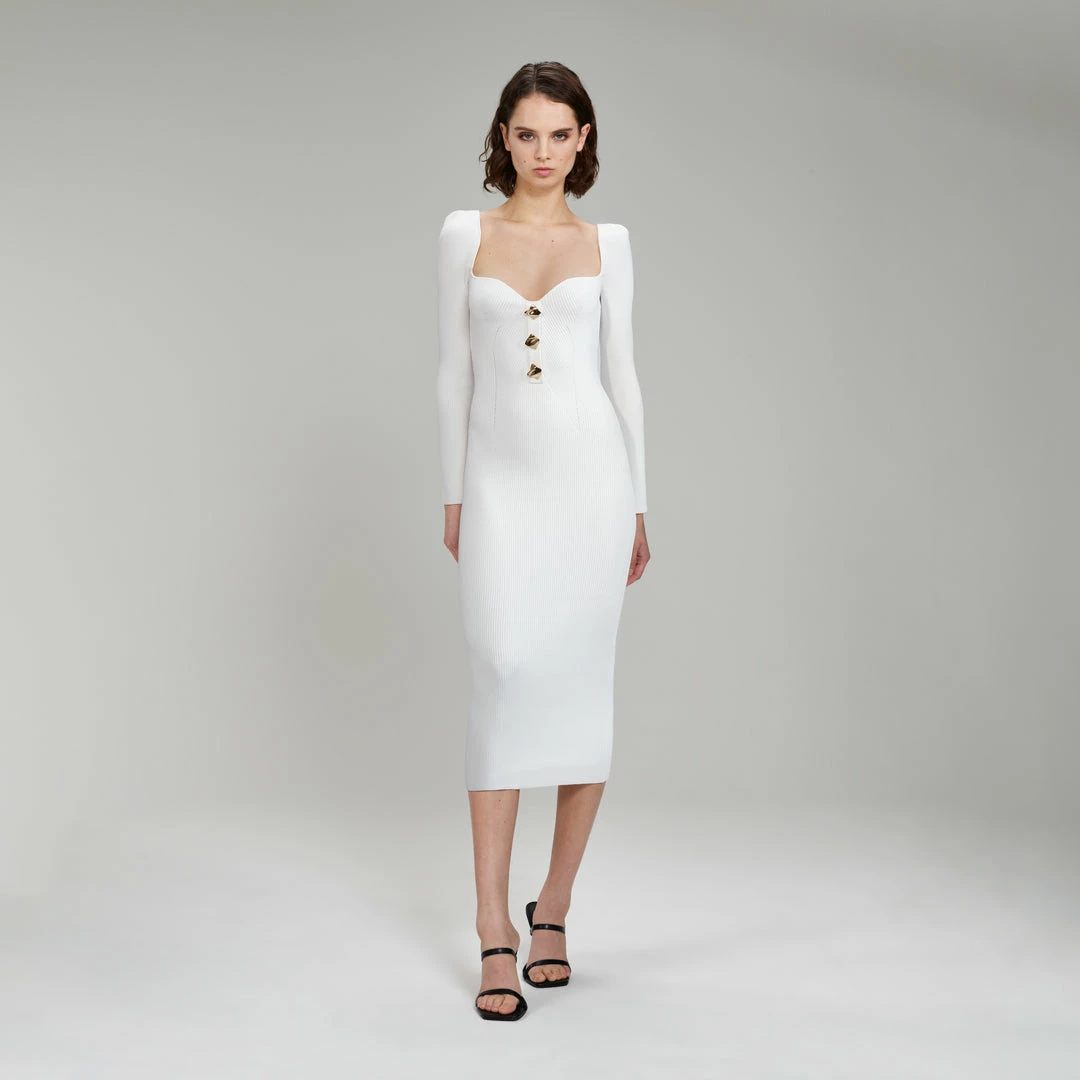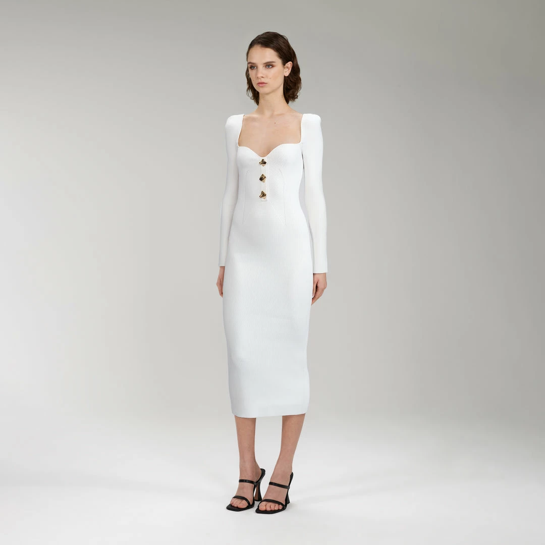 Put your curves on display in this sculpted white midi dress, cut from foolproof ribbed viscose. A fluid neckline frames the bodice, while statement gold buttons accessorise with an artistic touch. A perfect transitional item to pair with flats or stilettos depending on your mood. Check the Size Guide to find your perfect fit.