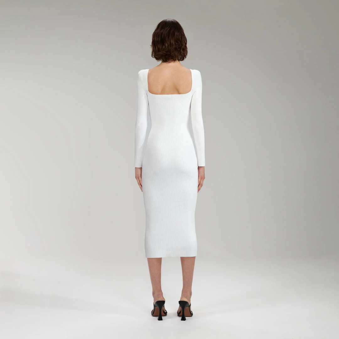 Self-portrait NEW ARRIVALS White Long Sleeve Ribbed Knit Midi Dress