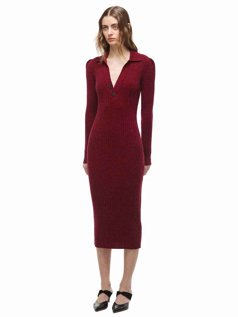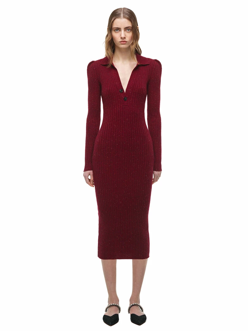 This cashmere collared ribbed knit midi dress is designed with a button front neckline and removable shoulder pads. The skirt is fitted through the body for a flattering silhouette. Check the Size Guide to find your perfect fit.