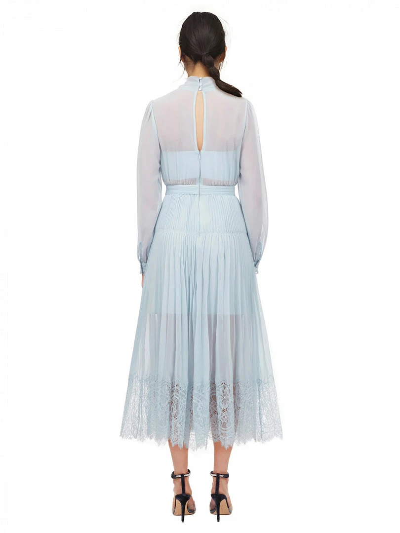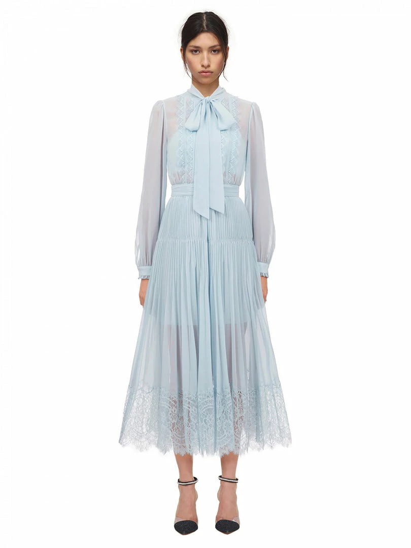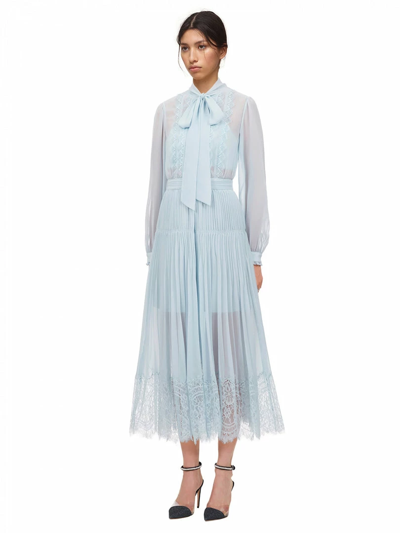 This fit and flare dress is cut from light blue chiffon. The style is designed with a flattering pussy bow and features tonal lace trims throughout.
