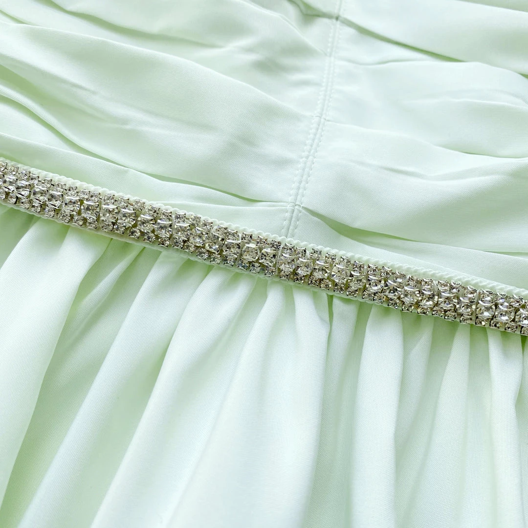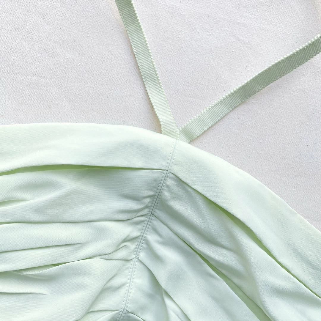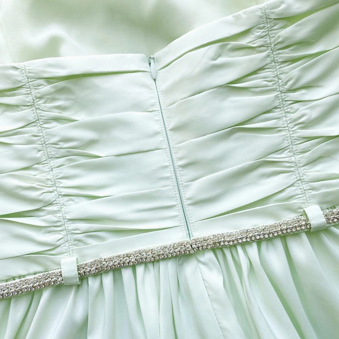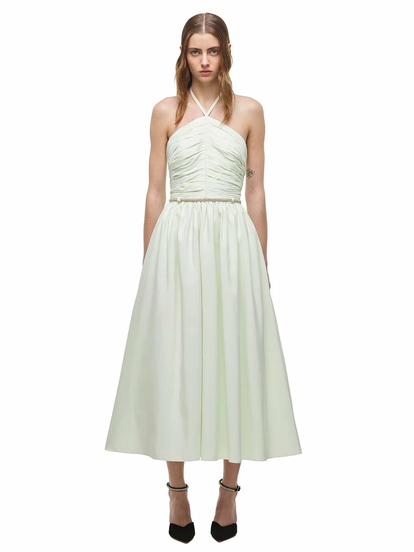 This midi dress is cut from pastel jade taffeta. Designed with a textured halter neck strap. It is fitted at the waist and falls to a full midi skirt. It is finished with a removable diamante belt. This style is lined. Check the Size Guide to find your perfect fit.