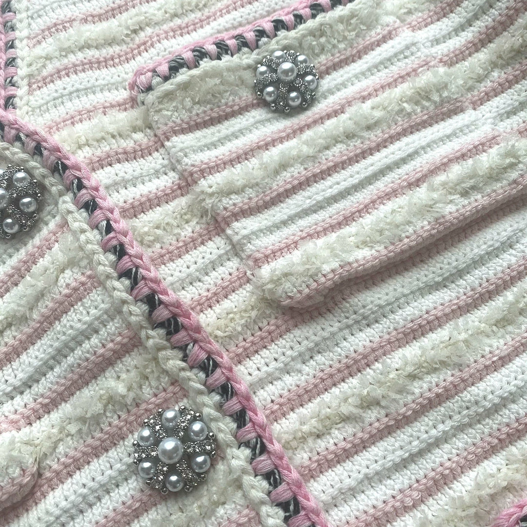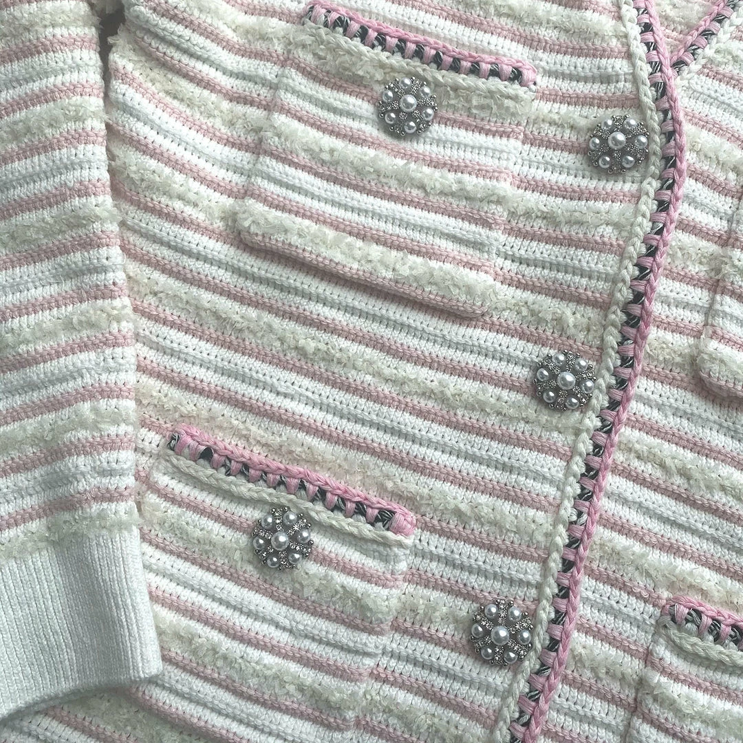 This pink and cream stripe knit oversized cardigan is designed with braided trims and front pockets. It is finished with pearl and diamante buttons. Check the Size Guide to find your perfect fit.