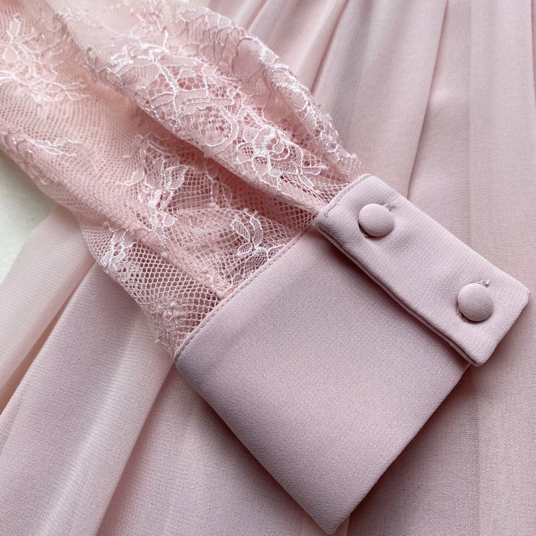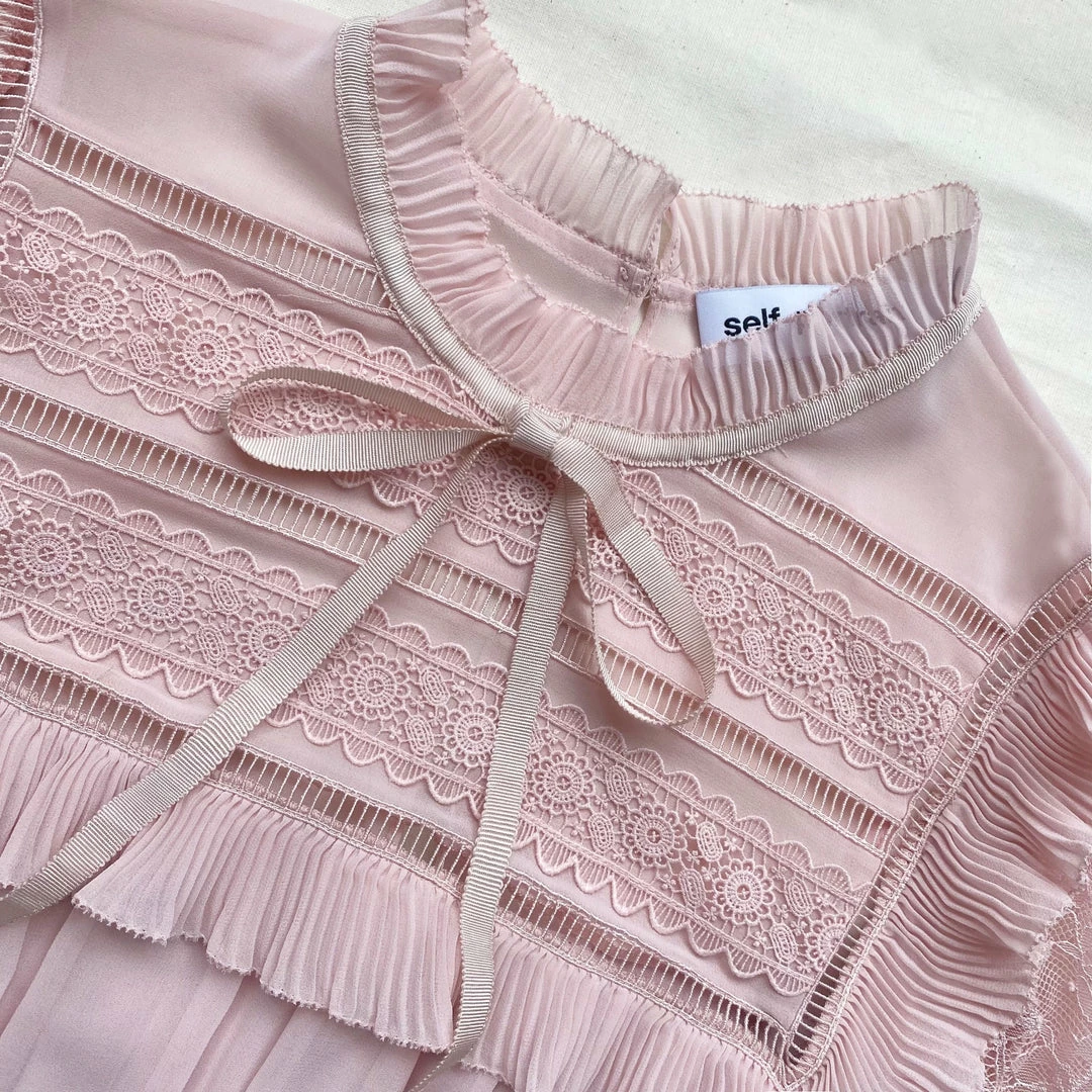 This dusty pink chiffon mini dress is designed with a lace trim bib framed with fine pleats. The high neck is finished with a delicate tie and the sleeves are cut from fine lace. The skirt is gathered at the waist and falls to mini length with broderie on the hem. Check the Size Guide to find your perfect fit.