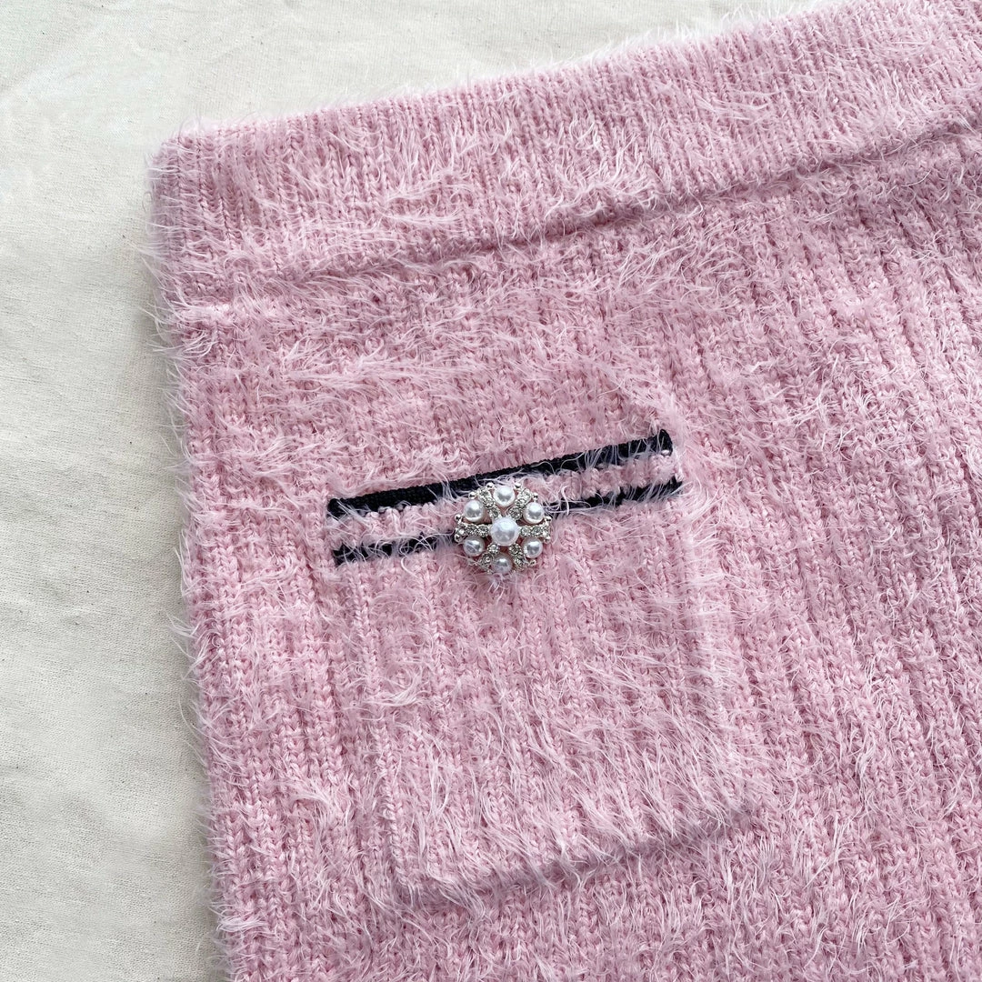 This pink fluffy knit mini skirt is designed with a slim fitting silhouette and features a diamante button on front pocket. Check the Size Guide to find your perfect fit.