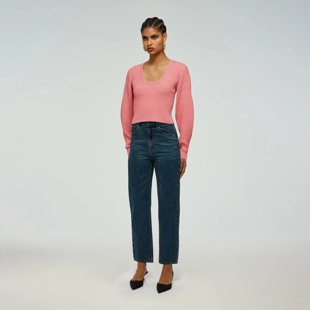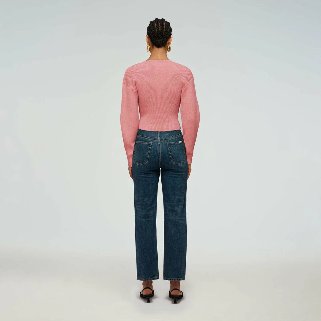 This pink knit jumper is designed with a scoop neckline and subtle balloon sleeves. Check the Size Guide to find your perfect fit.