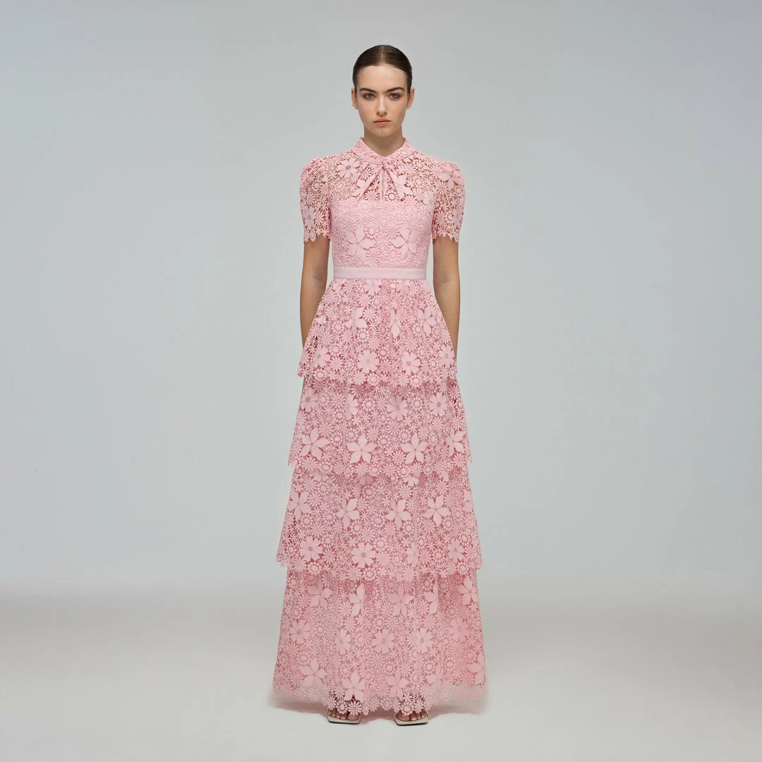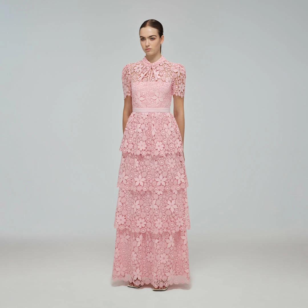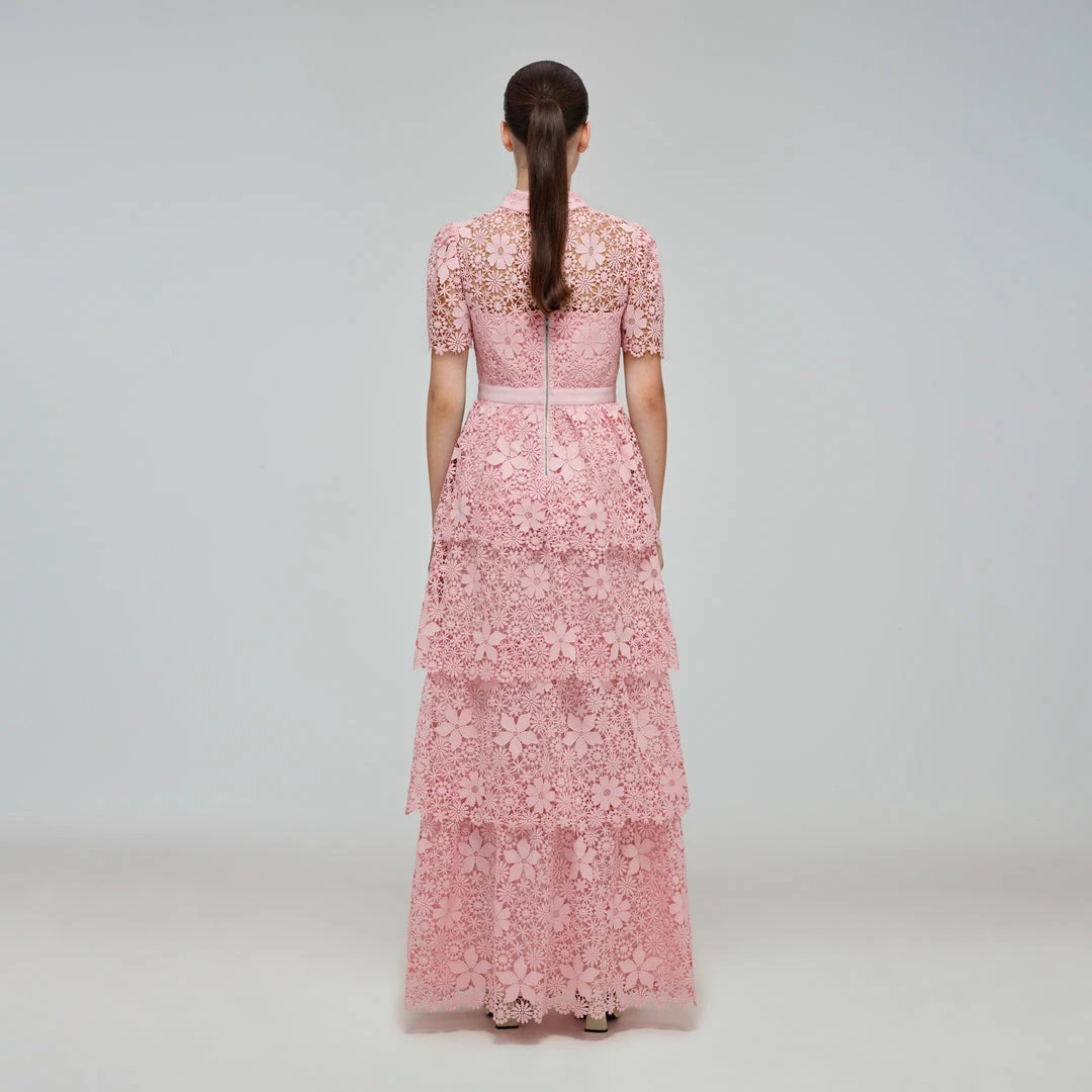 Self-portrait Pink Tiered Guipure Lace Maxi Dress