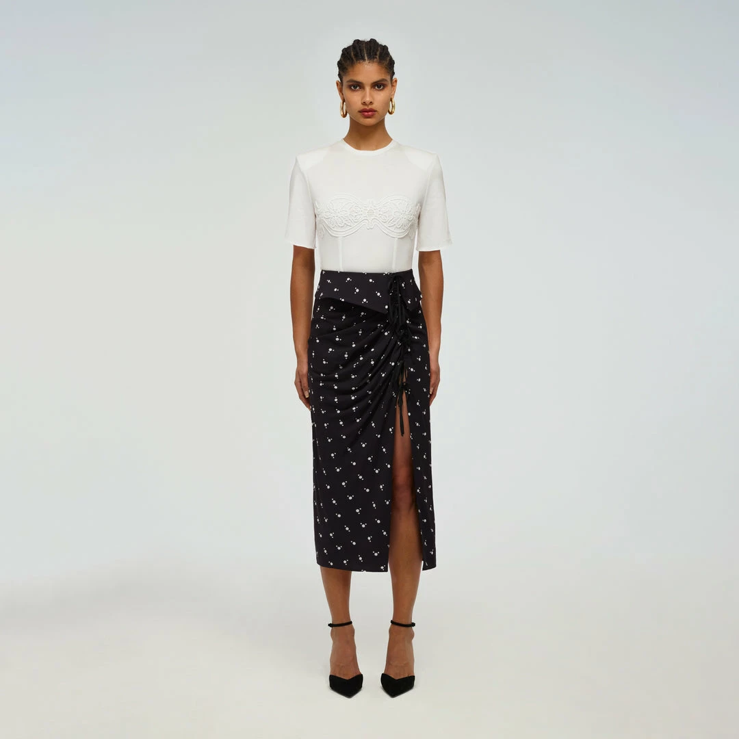 This midi skirt is cut from polka dot stretch crepe. It features a ruched design finished with bow details and split hem. Check the Size Guide to find your perfect fit.