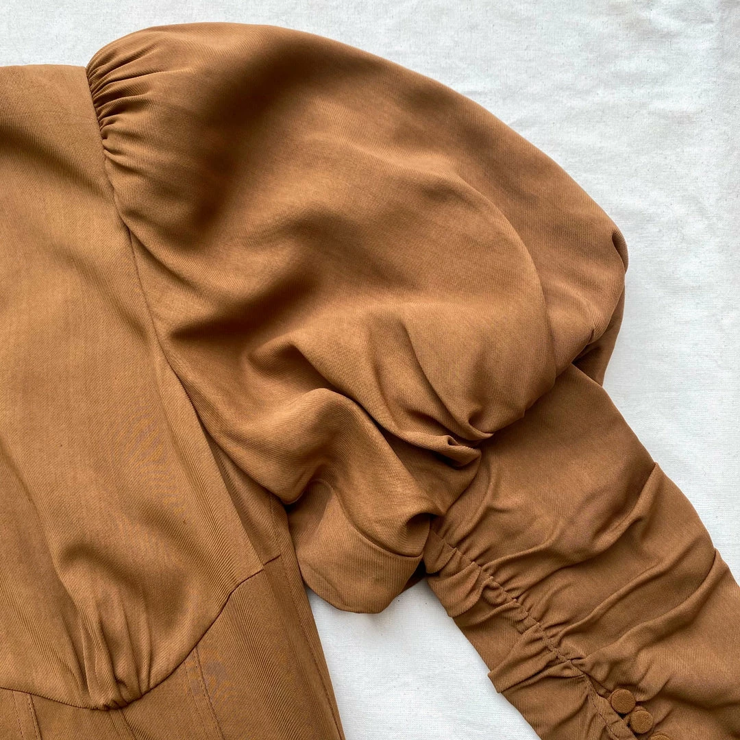 This midi dress is cut from stretch crepe. The sleeves are fitted and ruched through the arm and finished with statement puff shoulders. The bodice has a curved underbust seam and boning through the body. The wrap skirt is gathered and falls to a fitted silhouette. Check the Size Guide to find your perfect fit.