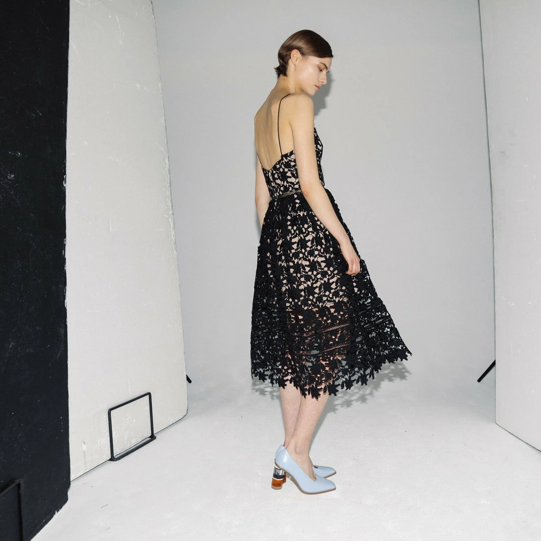 The Azaelea Dress is crafted using textured black lace. The dress features delicate spaghetti straps and the front neckline is framed with a scallop edge. The skirt has a full, pleated silhouette and features a hand-cut, raw lace hemline. The dress fastens neatly at the plunging back with an exposed zip and nude lining. Check the Size Guide to find your perfect fit.