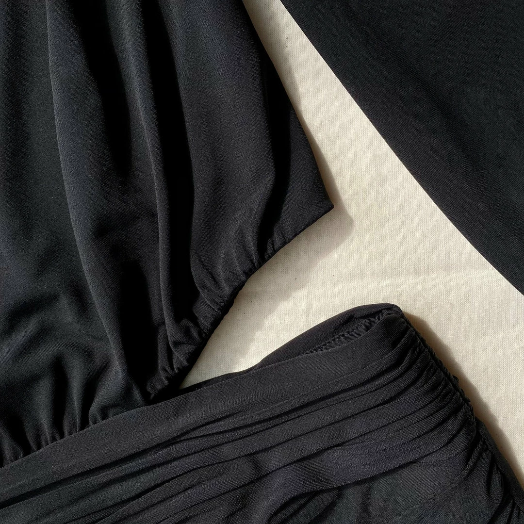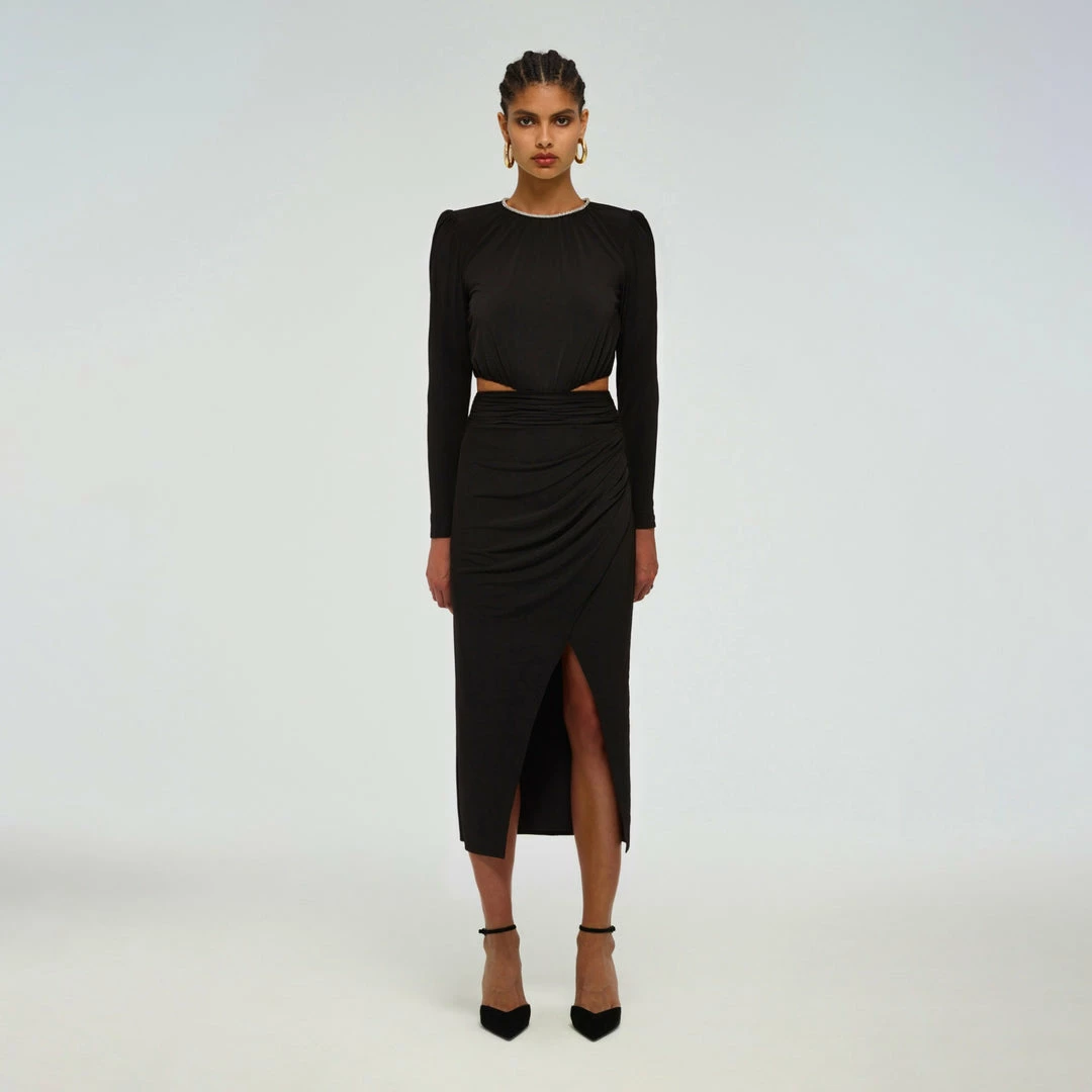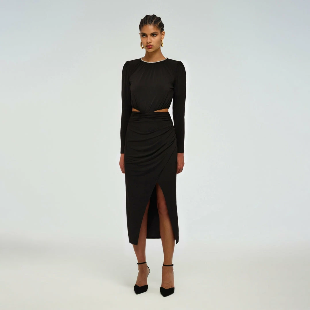 This black midi dress is cut from heavy jersey. It is designed with a diamante trim at the neck and a cut out waist detail. The wrap skirt is gathered and falls to a fitted silhouette. Check the Size Guide to find your perfect fit.