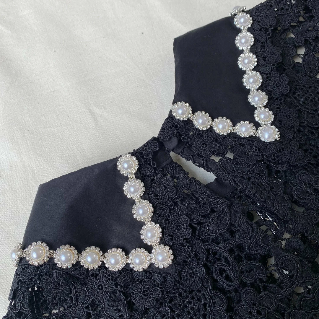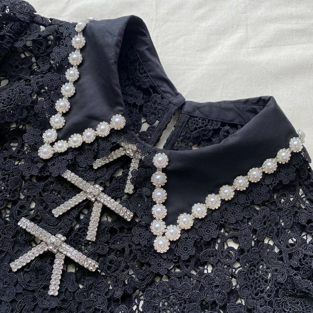 This black short sleeve mini dress is cut from floral guipure lace. It features a statement collar finished with diamante and lace trims. The front is detailed with diamante bow trims. The skirt is gathered through the waist and falls to a full silhouette. Check the Size Guide to find your perfect fit.
