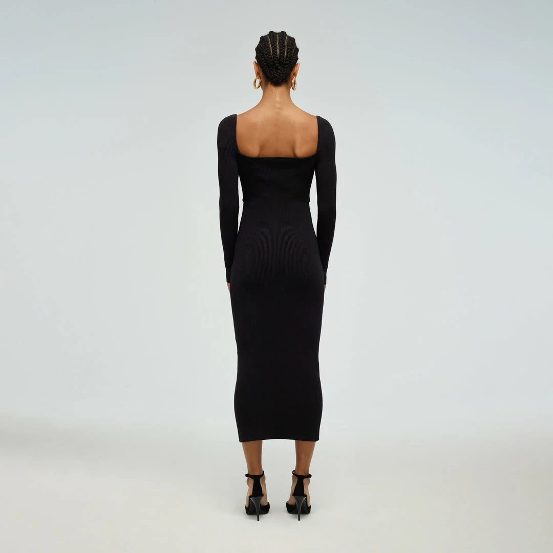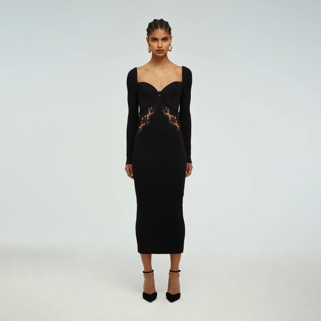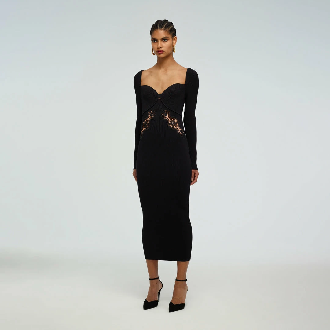 This black knit midi dress is designed with a fitted silhouette. It features a flattering sweetheart neckline and placement lace inserts. Check the Size Guide to find your perfect fit.