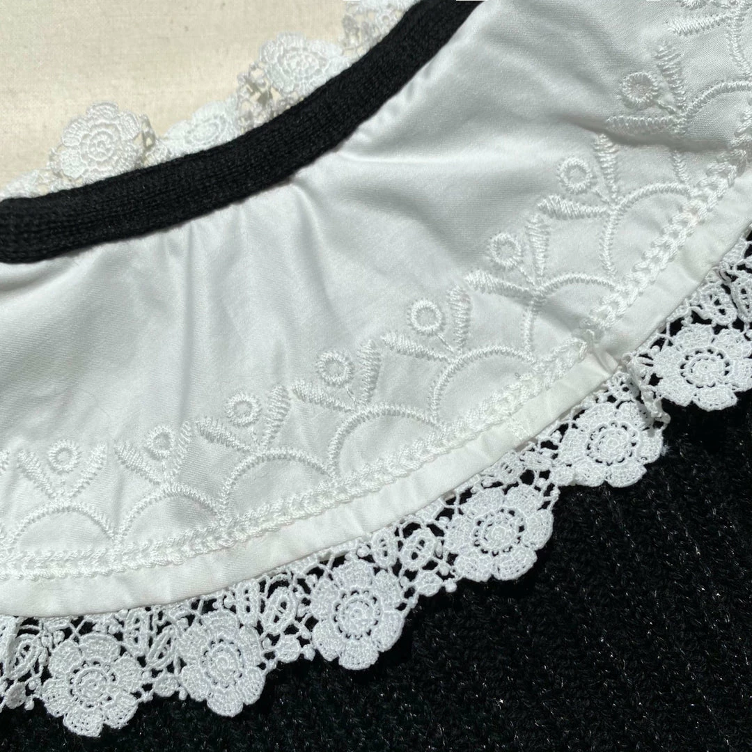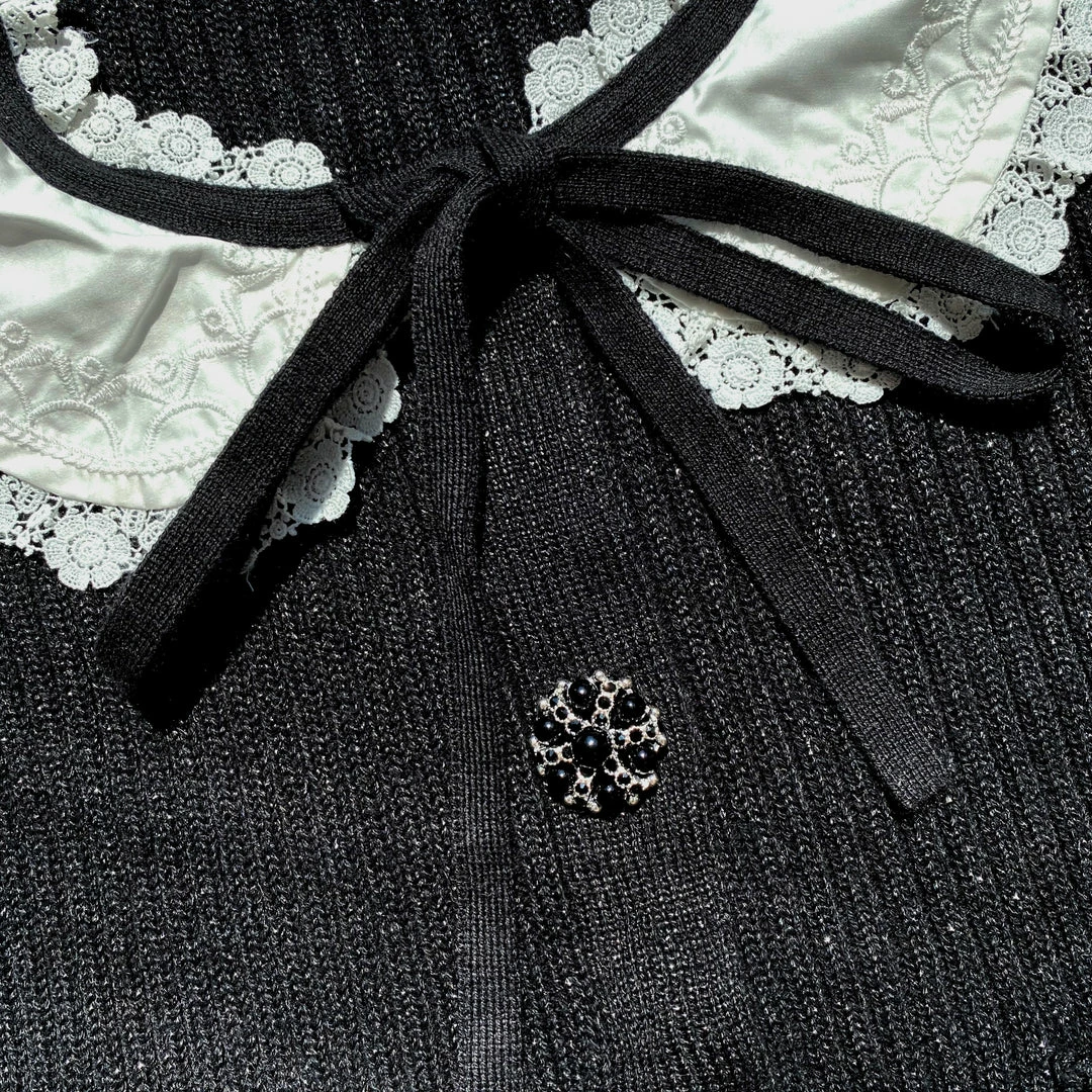 This black lurex cropped cardigan is designed with a contrast lace trim collar and neck tie detail. It fastens at the front with diamante buttons. Check the Size Guide to find your perfect fit.