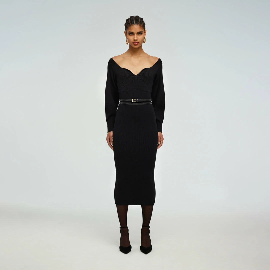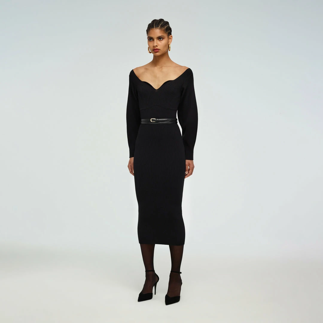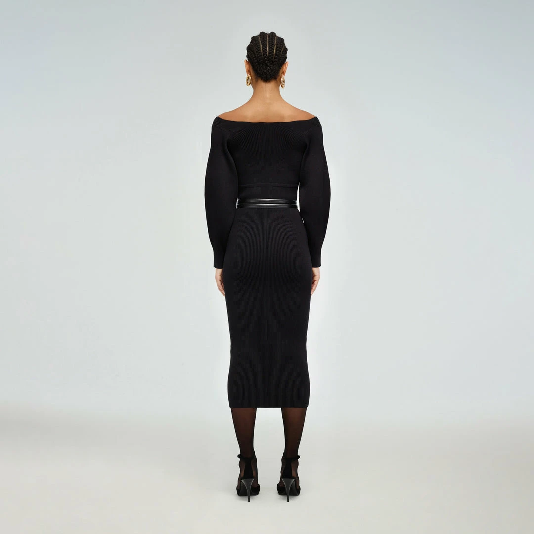 This black ribbed knit midi dress is designed with an off shoulder sweetheart neckline. It features subtle balloon sleeves and bustier details. The fitted silhouette sculpts the body and falls to a midi length skirt. Check the Size Guide to find your perfect fit.