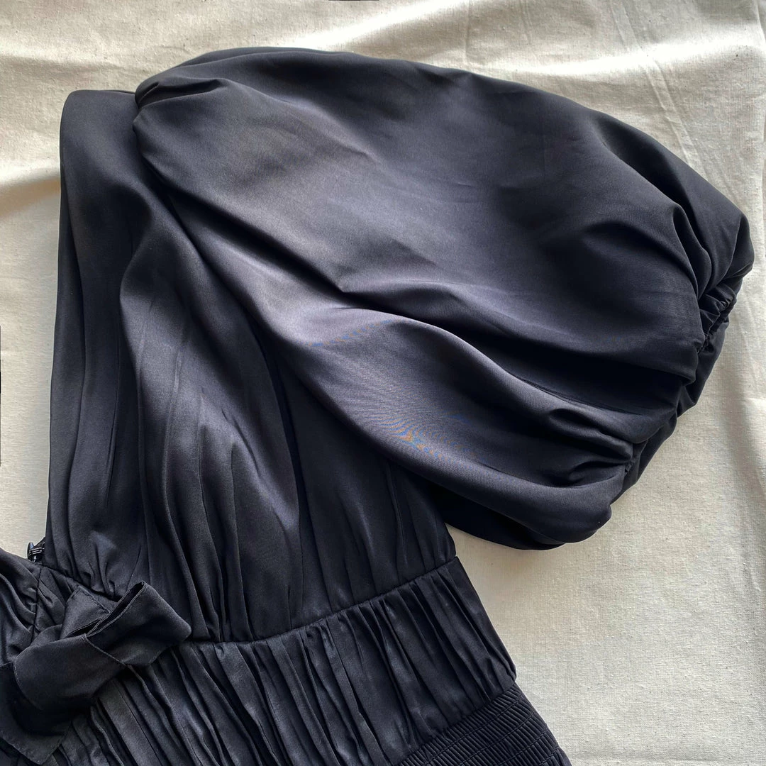 This top is cut from black taffeta. It features a flattering v-neckline and statement voluminous sleeves. Check the Size Guide to find your perfect fit.