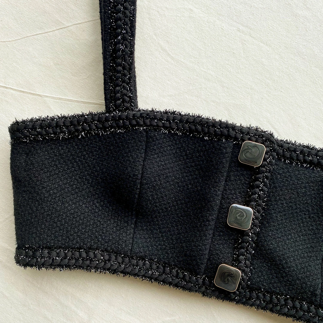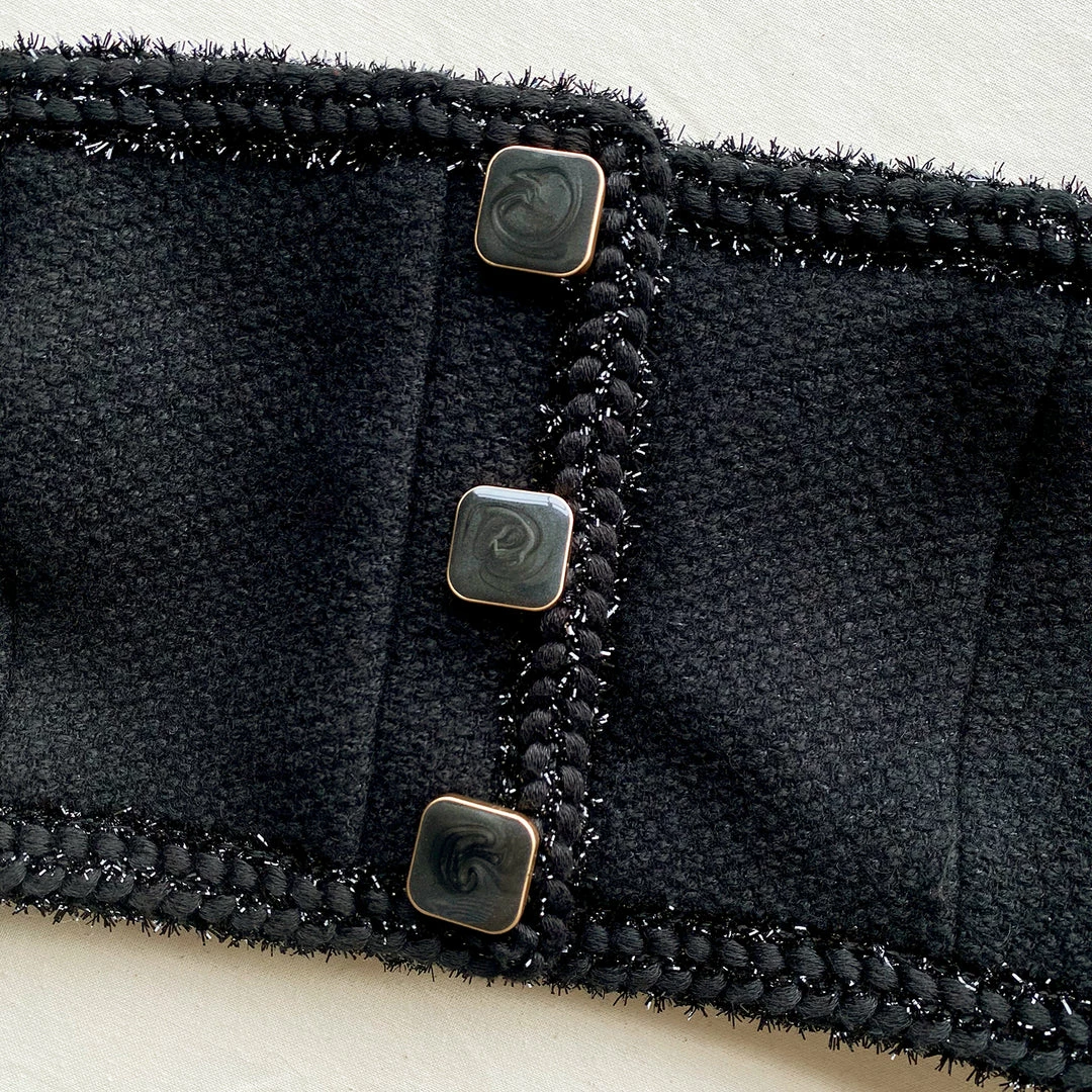 This crop top is cut from black textured fabric. It is designed with contrast metallic edges and is finished with square resin buttons. Check the Size Guide to find your perfect fit.