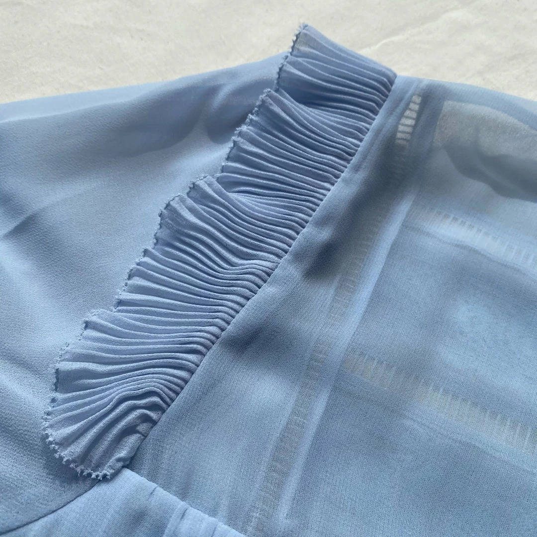 This light blue short sleeve chiffon midi dress is designed with a lace trim bib framed with fine pleats. The high neck is finished with a delicate tie. The skirt is gathered at the waist and falls to midi length with broderie on the hem. Check the Size Guide to find your perfect fit.